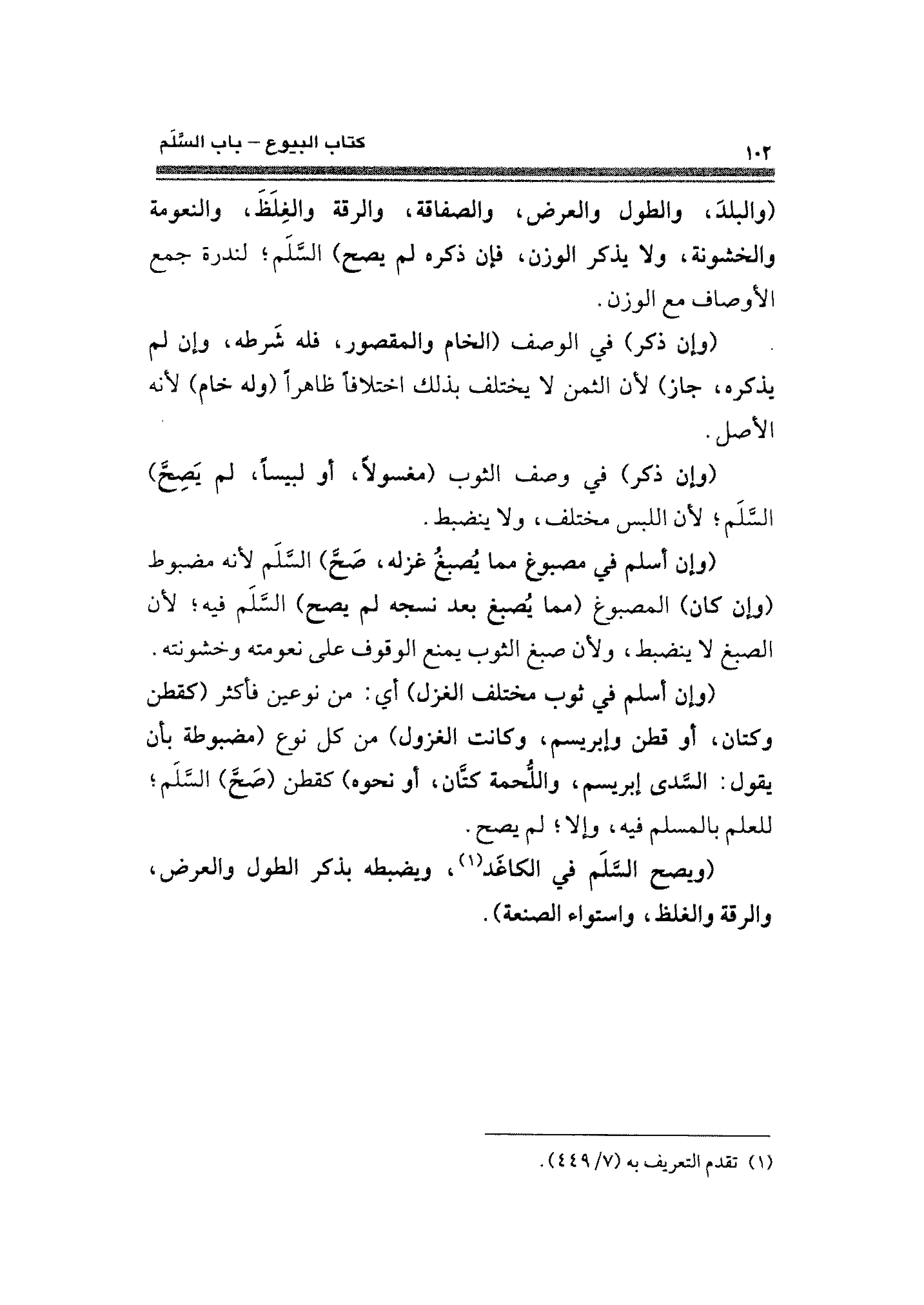 (والبلدَ، والطول والعرض، والصفاقة، والرقة والغِلَظَ، والنعومة والخشونة، ولا يذكر الوزن، فإن ذكره لم يصح) السَّلَم؛ لندرة جمع الأوصاف مع الوزن.