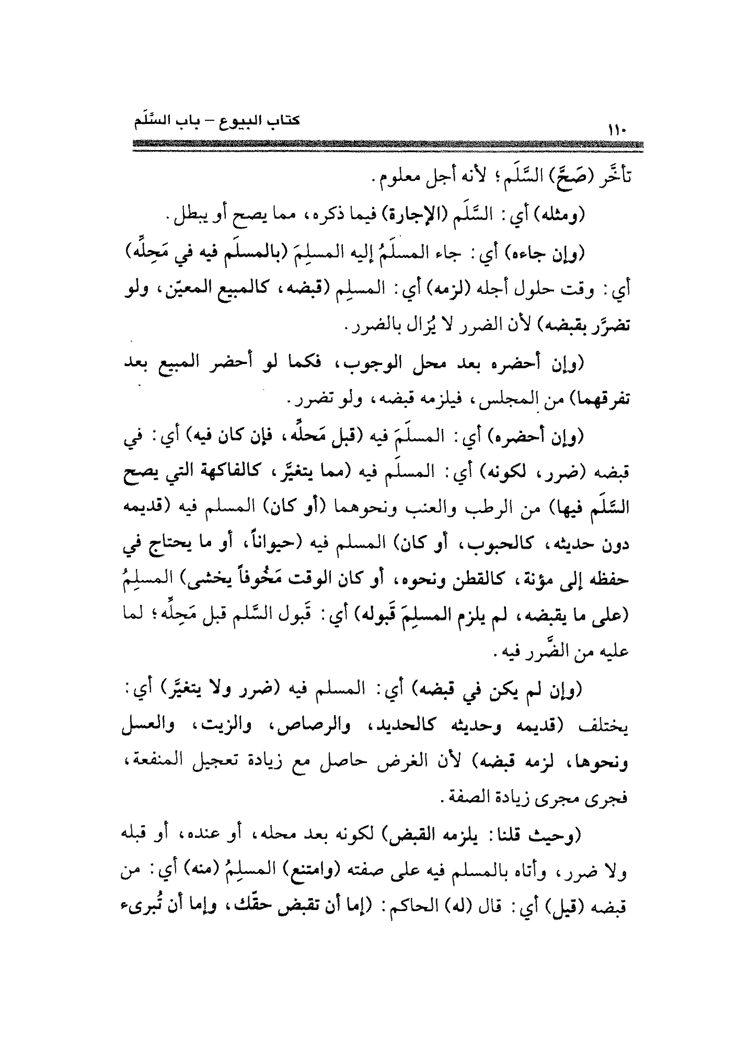 (وإن لم يكن في قبضه) أي: المسلم فيه (ضرر ولا يتغيَّر) أي: يختلف (قديمه وحديثه كالحديد والرصاص، والزيت، والعسل ونحوها، لزمه قبضه) لأن الغرض حاصل مع زيادة تعجيل المنفعة، فجرى مجرى زيادة الصفة.