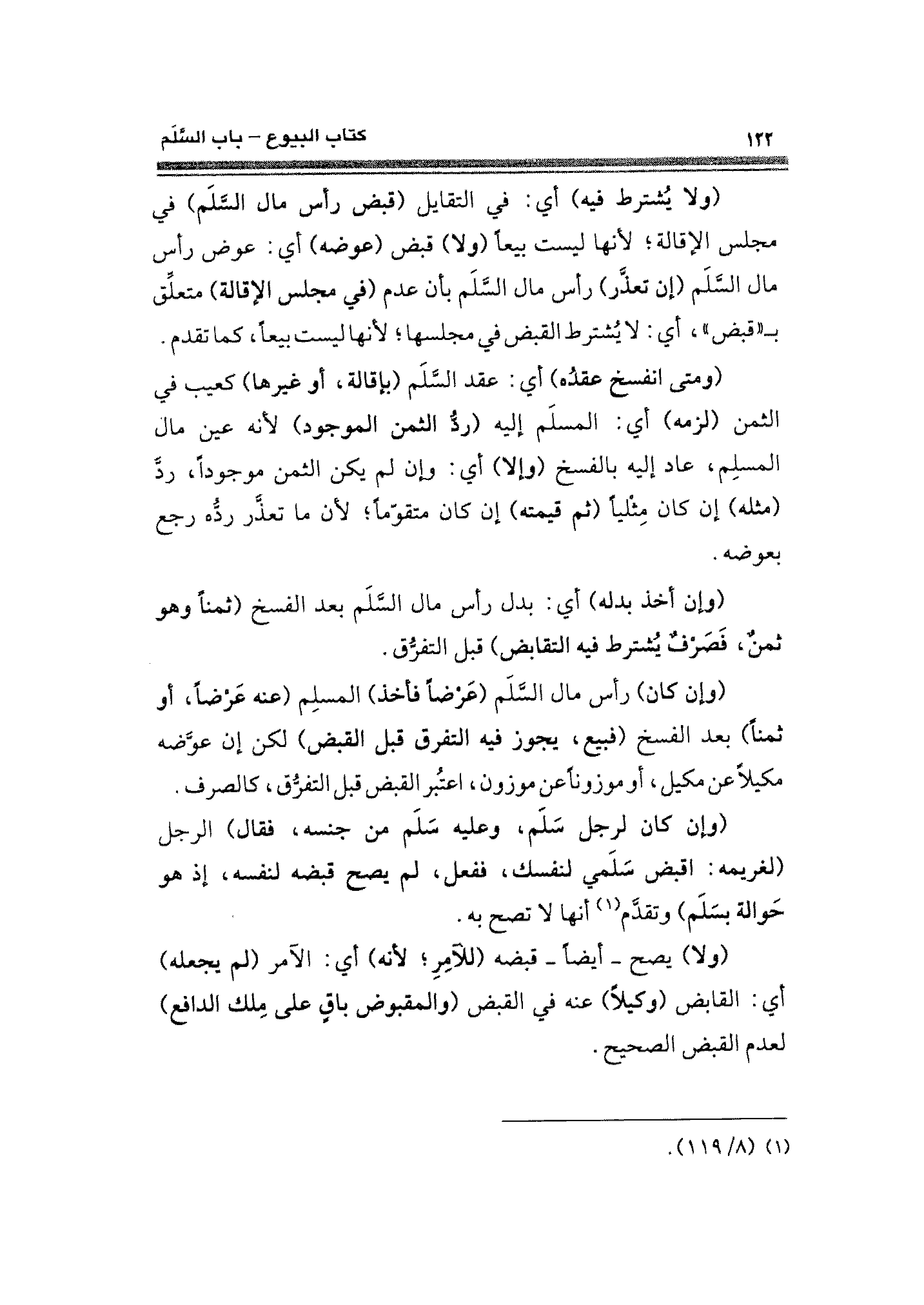 (ولا يُشترط فيه) أي: في التقايل (قبض رأس مال السَّلَم) في مجلس الإقالة؛ لأنها ليست بيعًا (ولا) قبض (عوضه) أي: عرض رأس مال السَّلَم (إن تعذَّر) رأس مال السَّلَم بأن عدم (في مجلس الإقالة) متعلِّق بـ "قبض"، أي: لا يُشترط القبض في مجلسها؛ لأنها ليست بيعًا، كما تقدم.