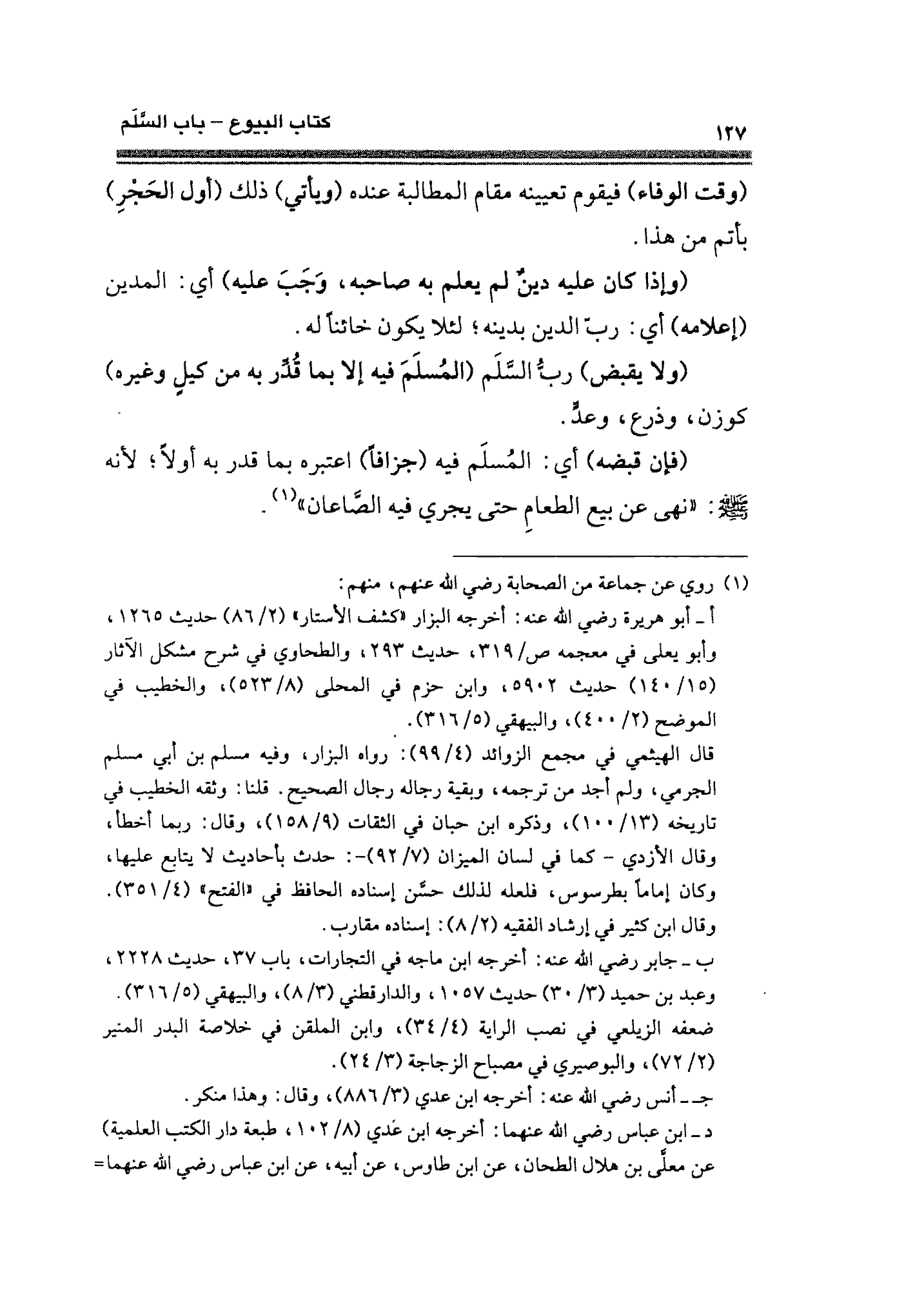 (فإن قبضه) أي: المُسلَم فيه (جزافًا) اعتبره بما قدر به أولًا؛ لأنه - صلى الله عليه وسلم -: "نهى عن بيع الطعامِ حتى يجري فيه الصَّاعان" (¬١).