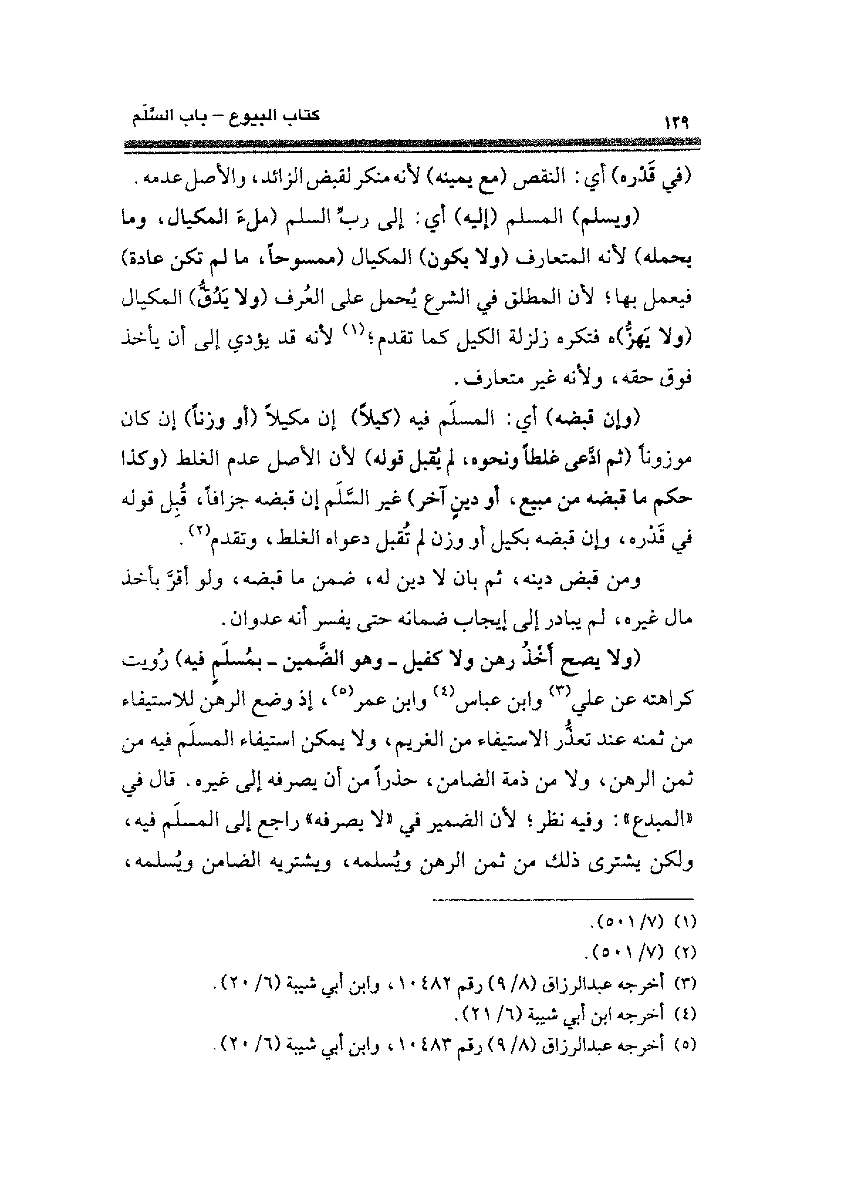 (ولا يصح أَخْذُ رهن ولا كفيل -وهو الضَّمين- بمُسلَمٍ فيه) رُويت كراهته عن علي (¬٣) وابن عباس (¬٤) وابن عمر (¬٥) إذ وضع الرهن للاستيفاء من ثمنه عند تعذُّر الاستيفاء من الغريم، ولا يمكن استيفاء المسلَم فيه من ثمن الرهن، ولا من ذمة الضامن، حذرًا من أن يصرفه إلى غيره، قال في "المبدع": وفيه نظر؛ لأن الضمير في "لا يصرفه" راجع إلى المسلَم فيه، ولكن يشترى ذلك من ثمن الرهن ويُسلمه، ويشتريه الضامن ويُسلمه،