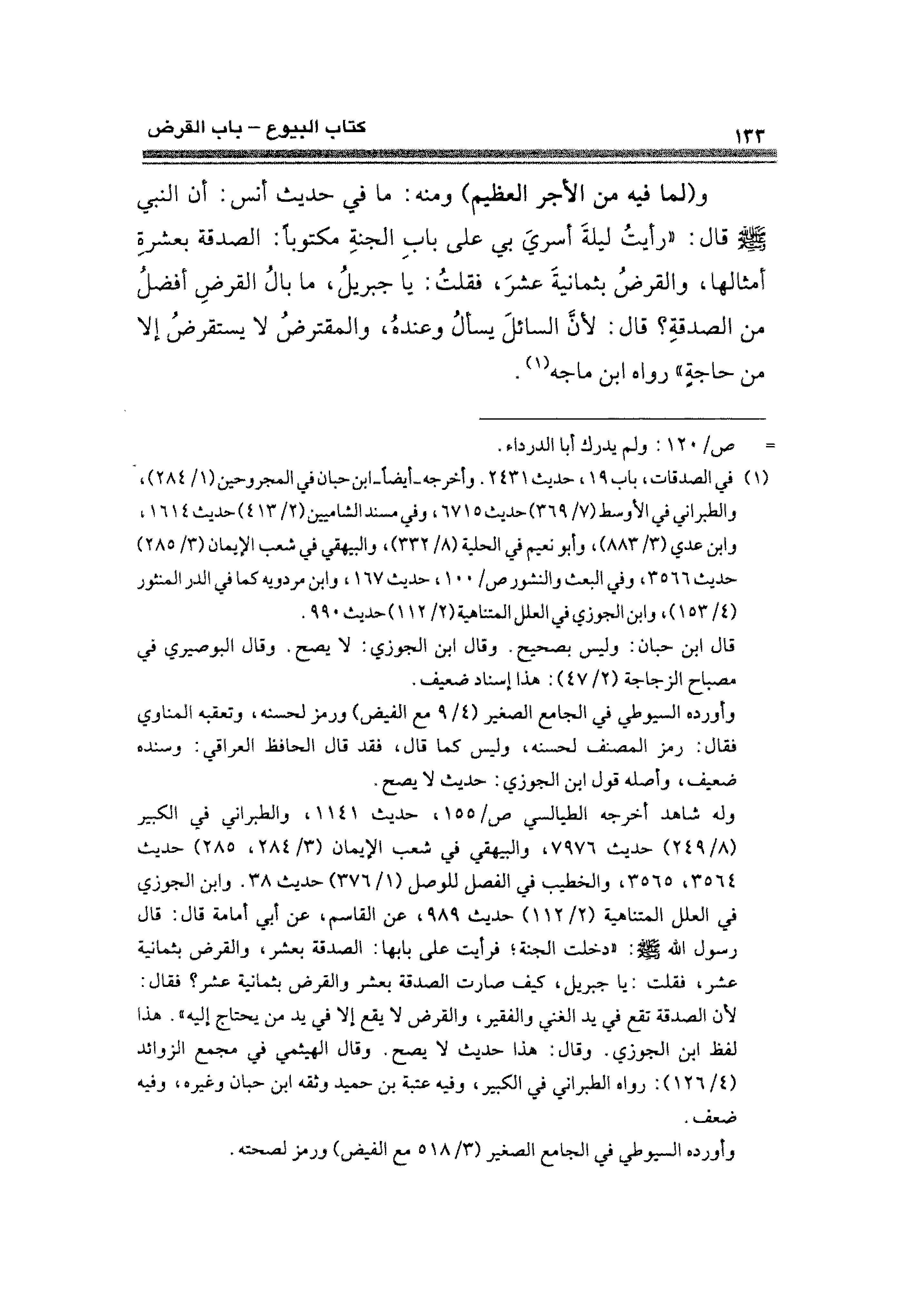 و (لما فيه من الأجر العظيم) ومنه: ما في حديث أنس: أن النبي - صلى الله عليه وسلم - قال: "رأيتُ ليلةَ أسريَ بي على بابِ الجنةِ مكتوبًا: الصدقة بعشرةِ أمثالها، والقرضُ بثمانيةَ عشرَ، فقلتُ: يا جبريلُ، ما بالُ القرضِ أفضلُ من الصدقةِ؟ قال: لأنَّ السائلَ يسألُ وعندهُ، والمقترضُ لا يستقرضُ إلا من حاجةٍ" رواه ابن ماجه (¬١).
