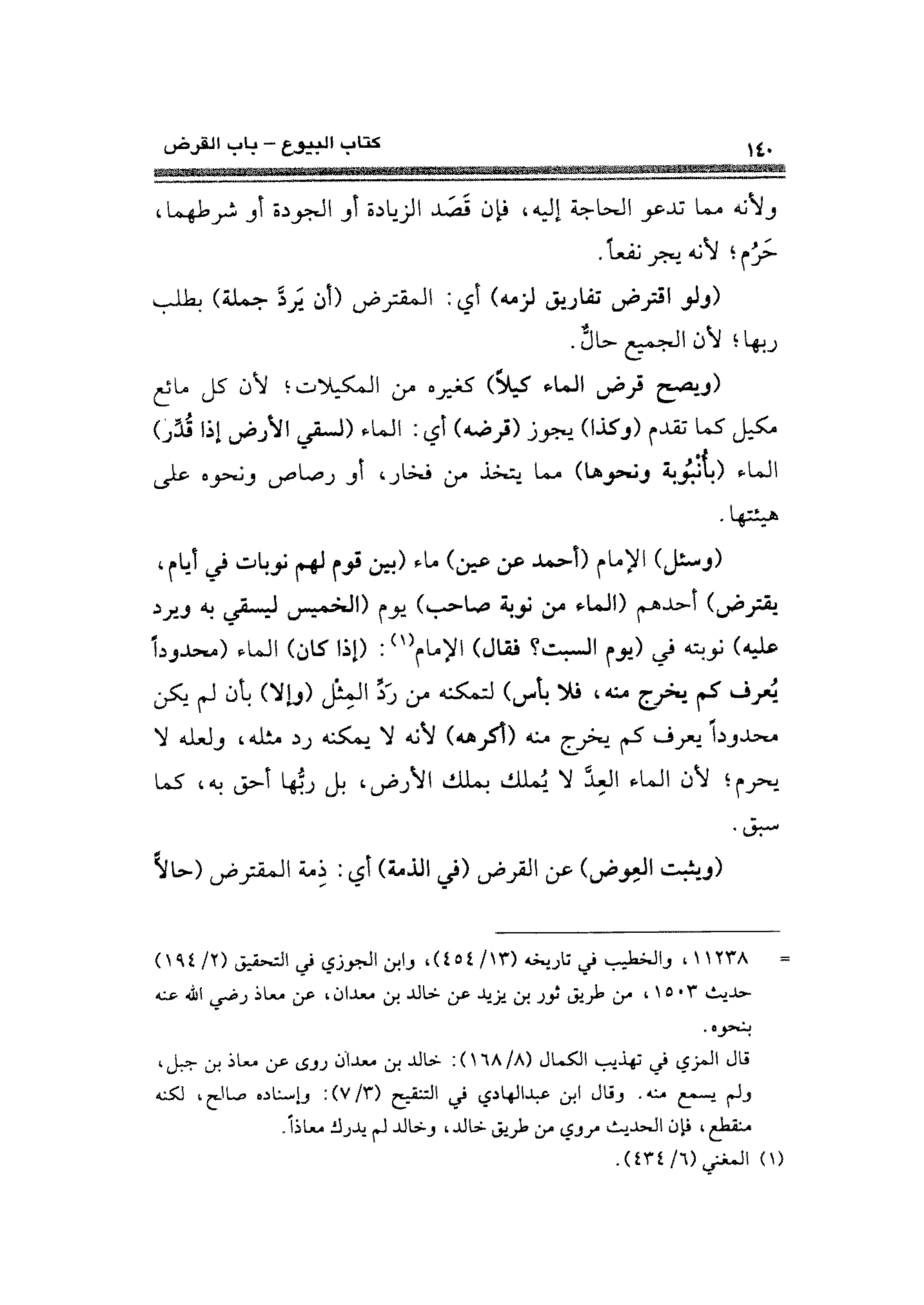 (وسئل) الإمام (أحمد عن عين) ماء (بين قوم لهم نوبات في أيام، يقترض) أحدهم (الماء من نوبة صاحب) يوم (الخميس ليسقي به ويرد عليه) نوبته في (يوم السبت؟ فقال) الإمام (¬١): (إذا كان) الماء (محدودًا يُعرف كم يخرج منه، فلا بأس) لتمكنه من رَدِّ المِثْل (وإلا) بأن لم يكن محدودًا يعرف كم يخرج منه (أكرهه) لأنه لا يمكنه رد مثله، ولعله لا يحرم؛ لأن الماء العِدَّ لا يُملك يملك الأرض، بل ربُّها أحق به، كما سبق.