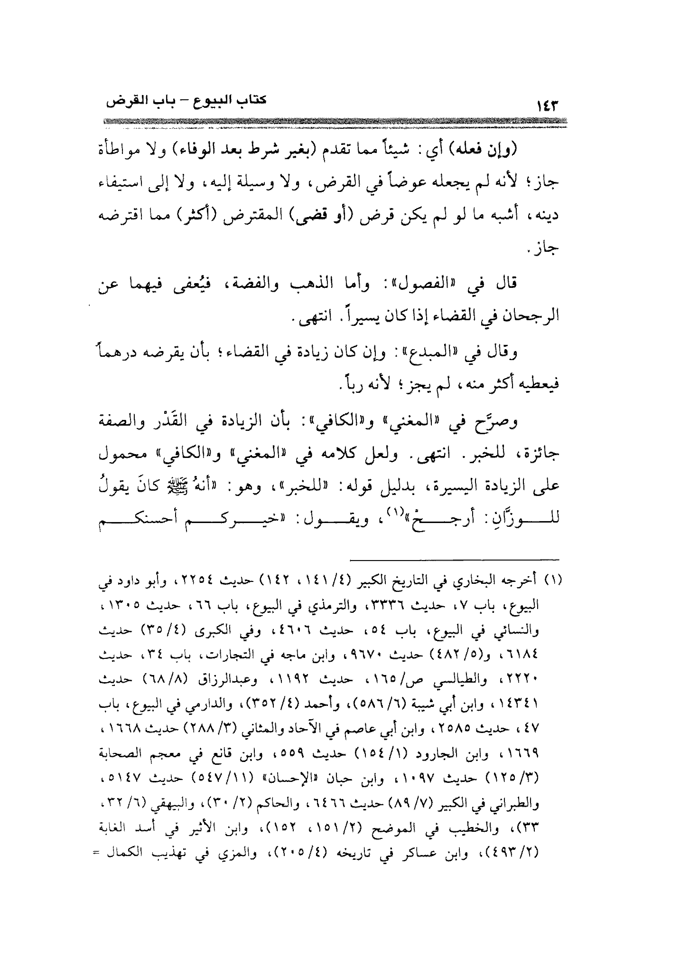 وصرَّح في "المغني" و"الكافي": بأن الزيادة فى القَدْر والصفة جائزة، للخبر. انتهى. ولعل كلامه في "المغني" و"الكافي" محمول على الزيادة اليسيرة، بدليل قوله: "للخبر"، وهو: "أنهُ - صلى الله عليه وسلم - كانَ يقولُ للوزَّانِ: أرجحْ" (¬١)، ويقول: "خيركم أحسنكم