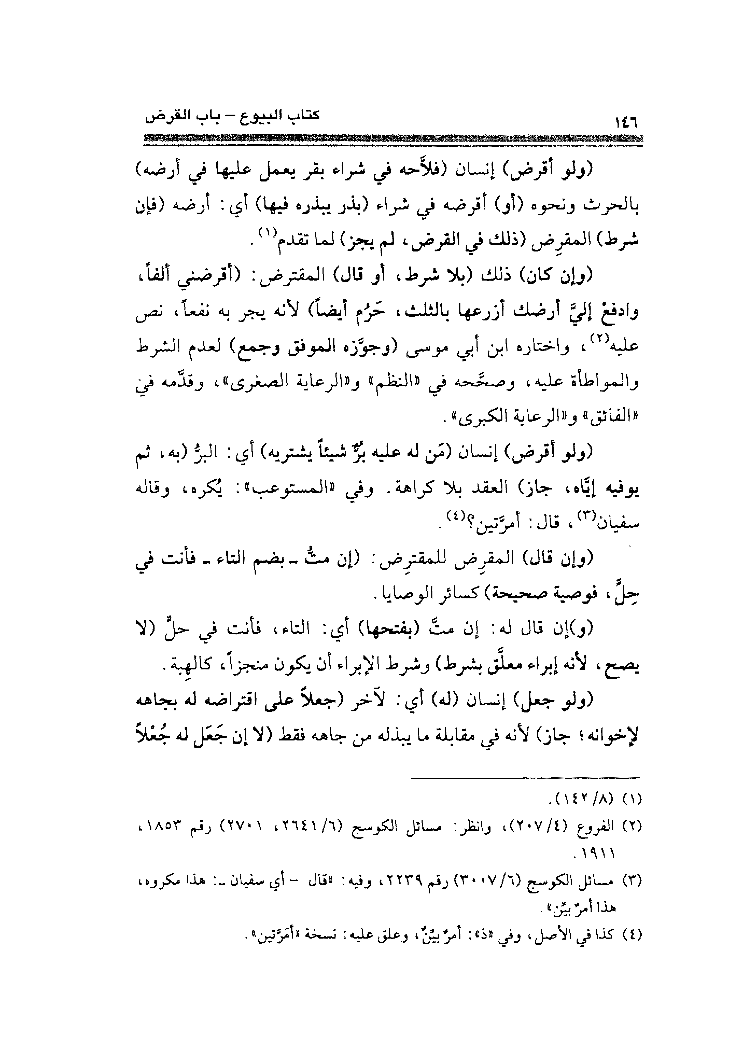 (وإن كان) ذلك (بلا شرط، أو قال) المقترض: (أقرضني ألفًا، وادفعْ إليَّ أرضك أزرعها بالثلث، حَرُم أيضًا) لأنه يجر به نفعًا، نص عليه (¬٢)، واختارة ابن أبي موسى (وجوَّزه الموفق وجمع) لعدم الشرط والمواطأة عليه، وصحَّحه في "النظم" و"الرعاية الصغرى"، وقدَّمه في "الفائق" و"الرعاية الكبرى".