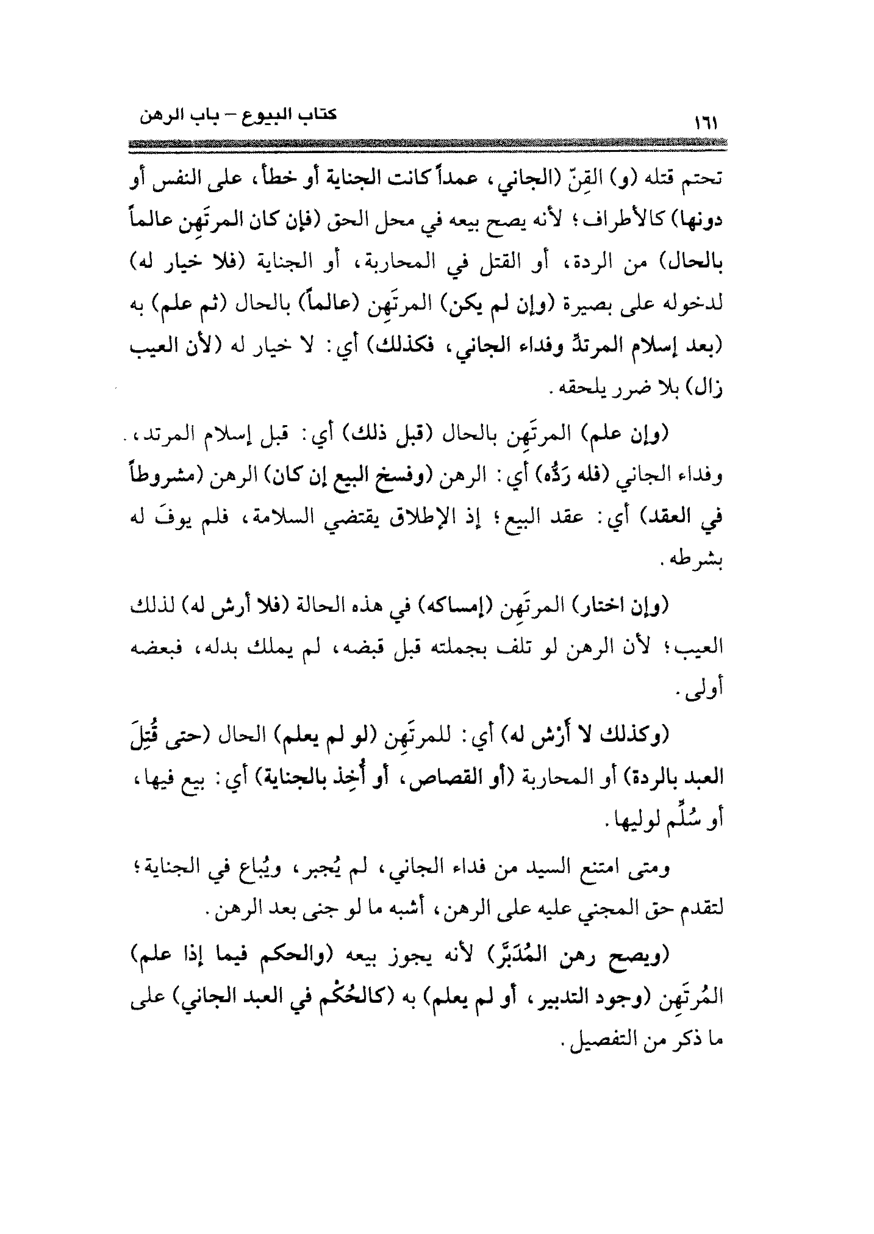 تحتم قتله (و) القِنّ (الجاني، عمدًا كانت الجناية أو خطأ، على النفس أو دونها) كالأطراف؛ لأنه يصح بيعه في محل الحق (فإن كان المرتَهِن عالمًا بالحال) من الردة، أو القتل في المحاربة، أو الجناية (فلا خيار له) لدخوله على بصيرة (وإن لم يكن) المرتَهِن (عالمًا) بالحال (ثم علم) به (بعد إسلام المرتدِّ وفداء الجاني، فكذلك) أي: لا خيار له (لأن العيب زال) بلا ضرر يلحقه.
