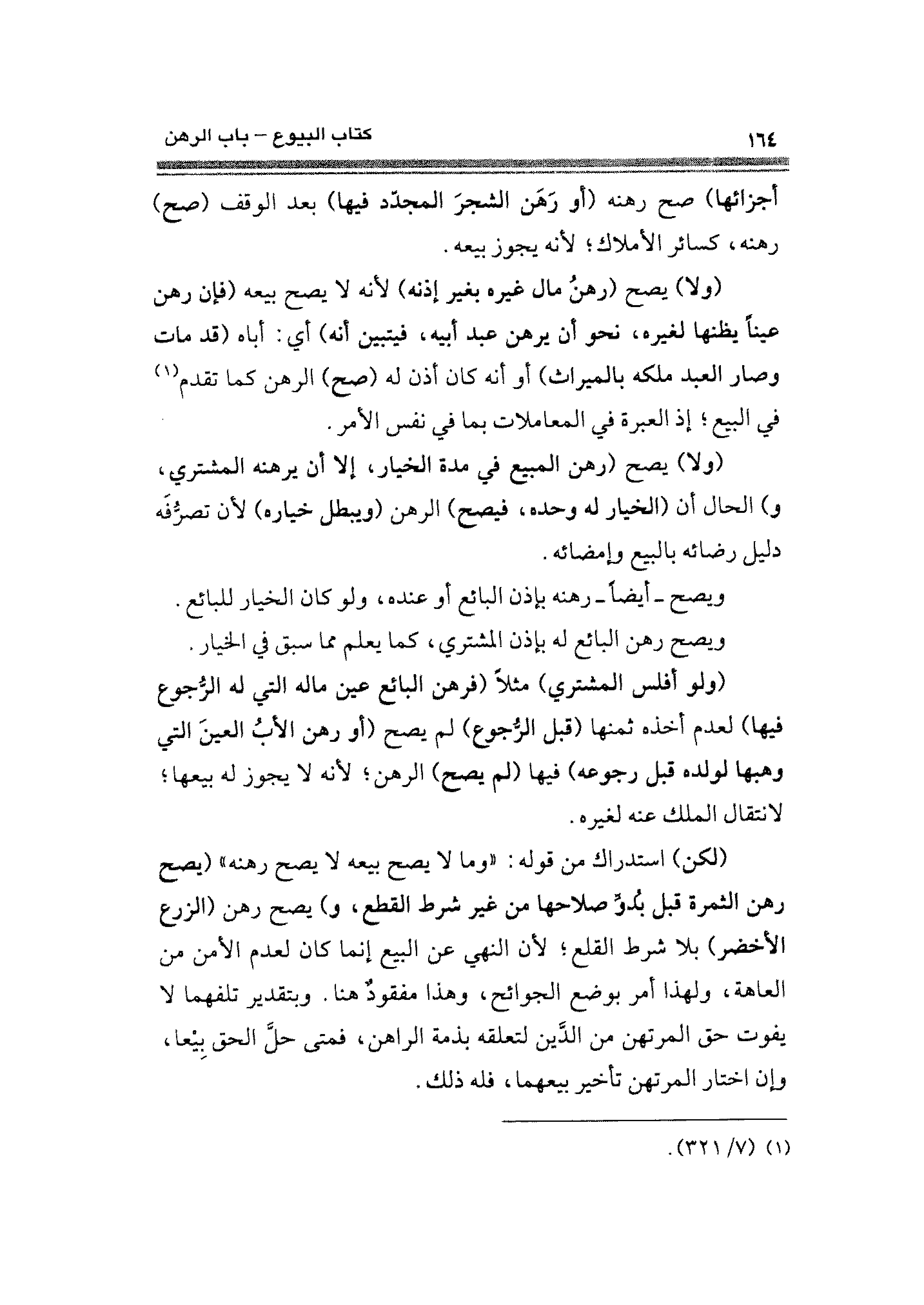 أجزائها) صح رهنه (أو رَهَن الشجرَ المجدّد فيها) بعد الوقف (صح) رهنه، كسائر الأملاك؛ لأنه يجوز بيعه.