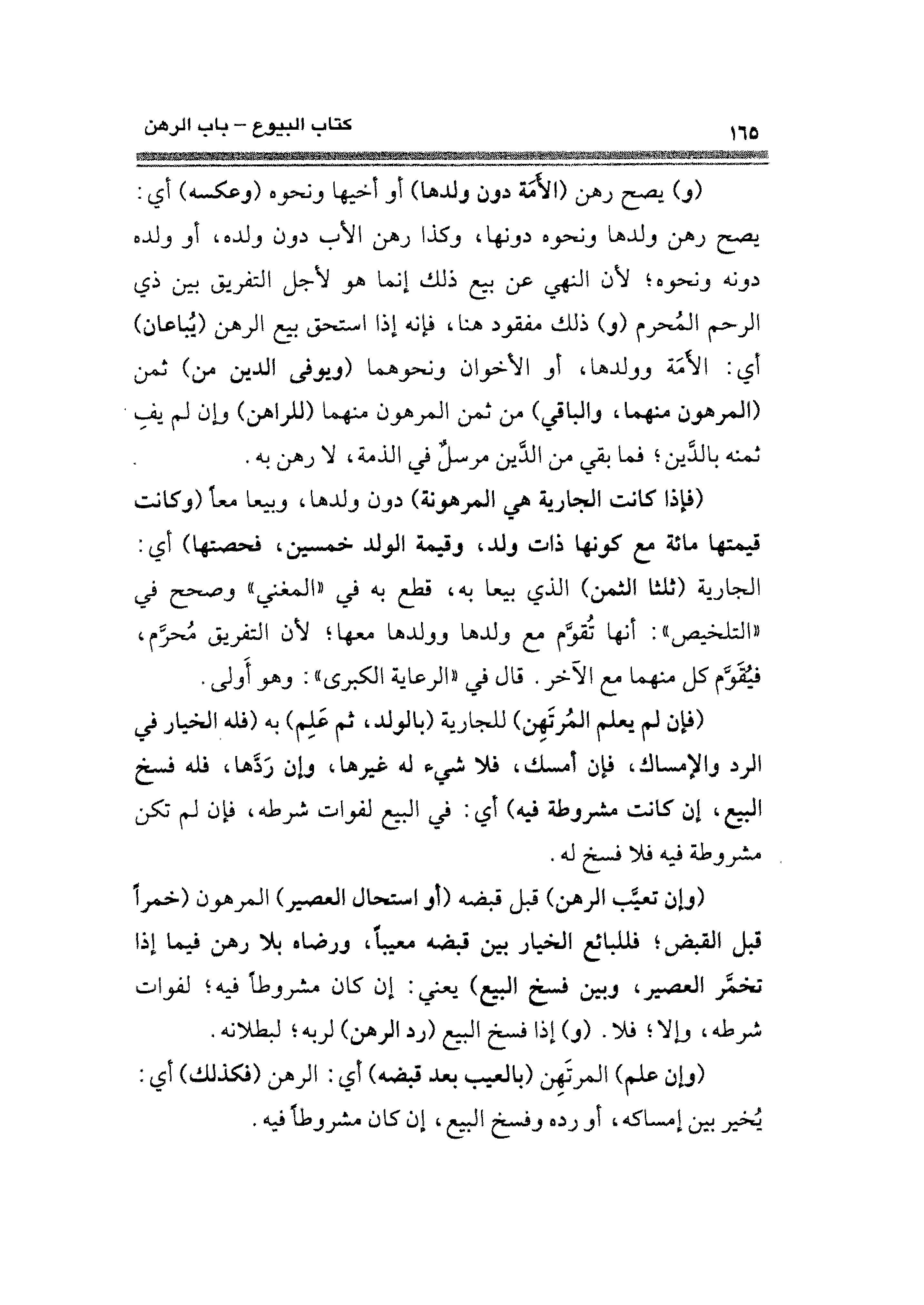 (و) يصح رهن (الأمَة دون ولدها) أو أخيها ونحوه (وعكسه) أي: يصح رهن ولدها ونحوه دونها، وكذا رهن الأب دون ولده، أو ولده دونه ونحوه؛ لأن النهي عن بيع ذلك إنما هو لأجل التفريق بين ذي الرحم المُحرم (و) ذلك مفقود هنا، فإنه إذا استحق بيع الرهن (يُباعان) أي: الأمَة وولدها، أو الأخوان ونحوهما (ويوفى الدين من) ثمن (المرهون منها، والباقي) من ثمن المرهون منهما اللراهن) وإن لم يفِ ثمنه بالدَّين؛ فما بقي من الدَّين مرسلٌ في الذمة، لا رهن به.