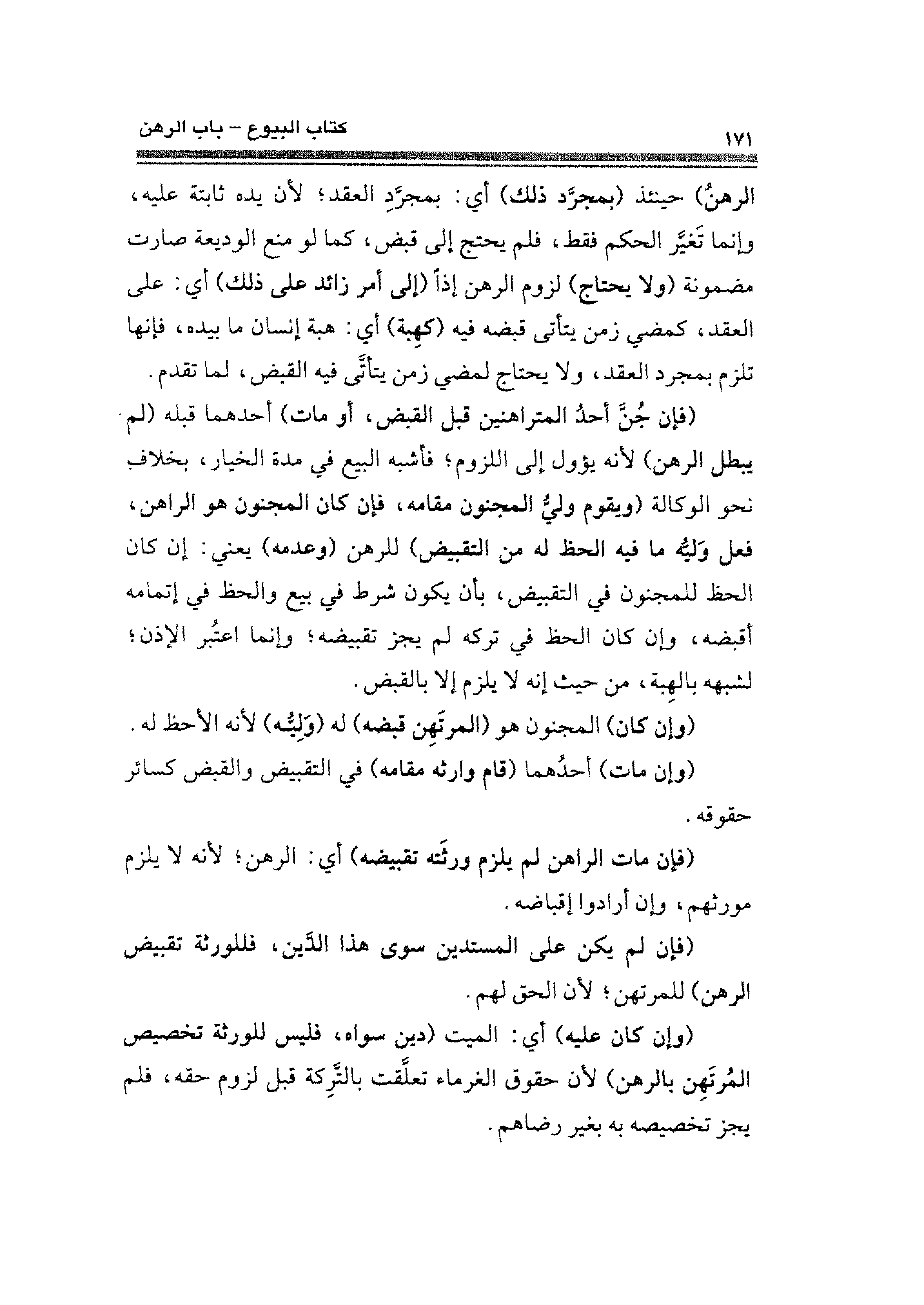 (فإن جُنَّ أحدُ المتراهنين قبل القبض، أو مات) أحدهما قبله (لم يبطل الرهن) لأنه يؤول إلى اللزوم؛ فأشبه البيع في مدة الخيار، بخلاف نحو الوكالة (ويقوم وليُ المجنون مقامه، فإن كان المجنون هو الراهن، فعل وَليه ما فيه الحظ له من التقبيض) للرهن (وعدمه) يعني: إن كان الحظ للمجنون في التقبيض، بأن يكون شرط في بيع والحظ في إتمامه أقبضه، وإن كان الحظ في تركه لم يجز تقبيضه؛ وإنما اعتبر الإذن؛ لشبهه بالهِبة، من حيث إنه لا يلزم إلا بالقبض.
