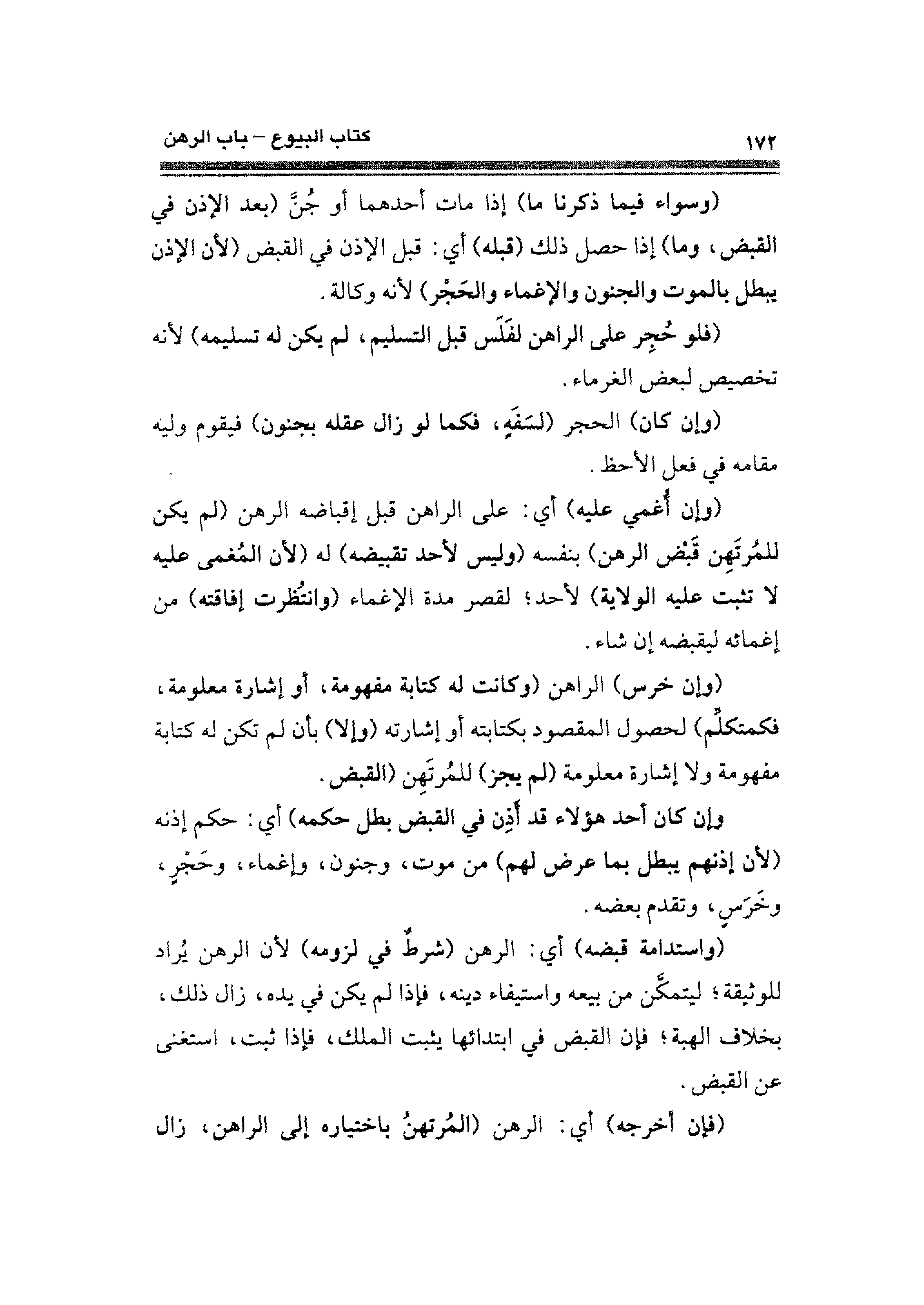 (واستدامة قبضه) أي: الرهن (شرط في لزومه) لأن الرهن يُراد للوثيقة؛ ليتمكَّن من بيعه واستيفاء دينه، فهذا لم يكن في يده، زال ذلك، بخلاف الهبة؛ فإن القبض في ابتدائها يثبت الملك، فإذا ثبت، استغنى من القبض.