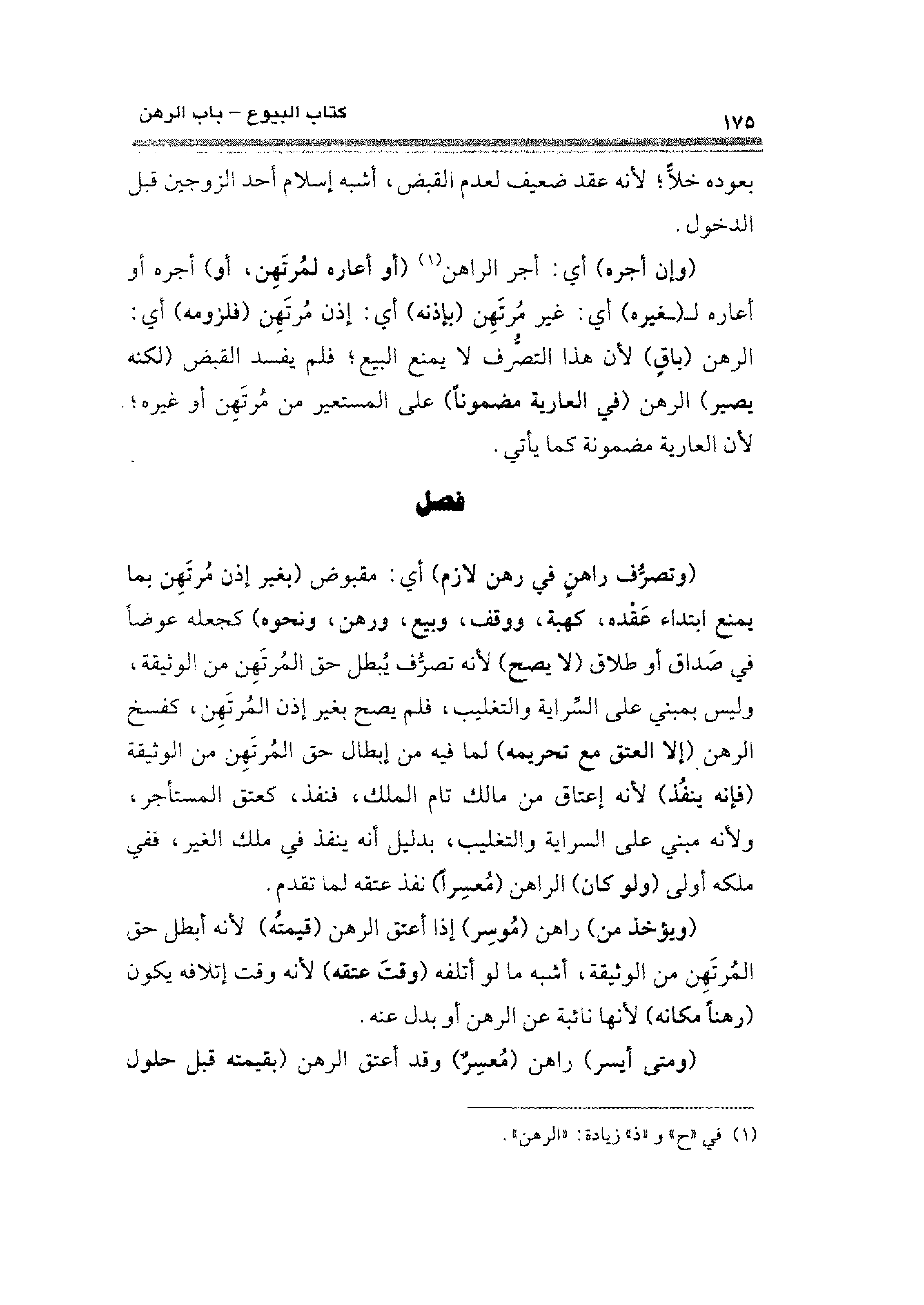 (وتصرُّف راهنٍ في رهن لازم) أي: مقبوض (بغير إذن مُرتهِن بما بمنع ابتداء عَقده، كهبة، ووقف، وبيع، ورهن، ونحوه) كجعله عرضًا في صَداق أو طلاق (لا يصح) لأنه تصرُّف يُبطل حق المُرتَهِن من الوثيقة، وليس بمبني على السِّراية والتغليب، فلم يصح بغير إذن المرتَهِن، كفسخ الرهن (إلا العتق مع تحريمه) لما فيه من إبطال حق المُرتَهِن من الوثيقة (فإنه ينفُذ) لأنه إعتاق من مالك قام الملك، فنفذ، كعتق المستأجر، ولأنه مبني على السراية والتغليب، بدليل أنه ينفذ في ملك الغير، ففي ملكه أولى (ولو كان) الراهن (معسِرًا) نفذ عتقه لما تقدم.