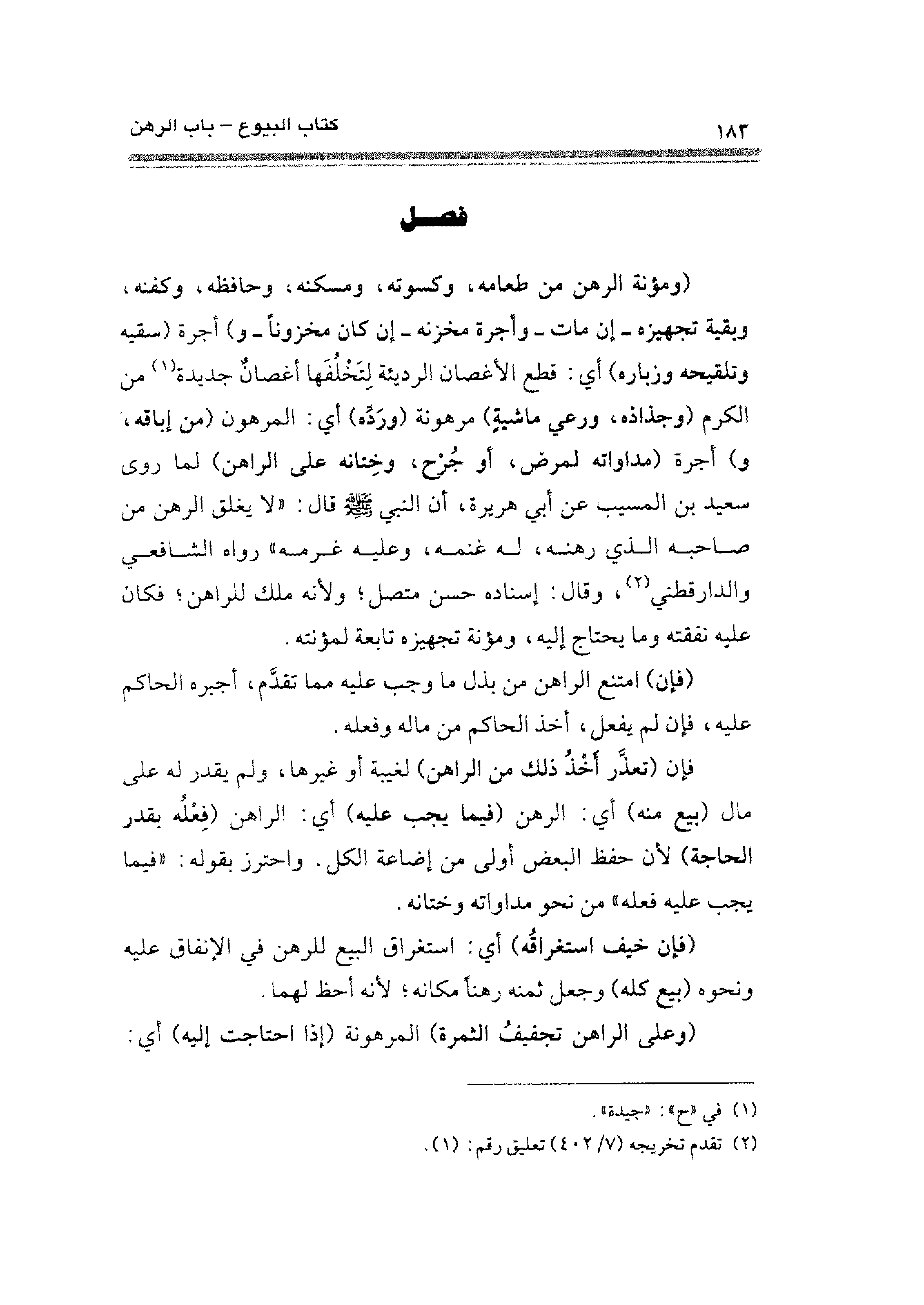 (ومؤنة الرهن من طعامه، وكسوته، ومسكنه، وحافظه، وكفنه، وبقية تجهيزه -إن مات- وأجرة مخزنه -إن كان مخزونًا- و) أجرة (سقيه وتلقيحه وزياره) أي: قطع الأغصان الرديئة لِتَخلُفَها أغصانٌ جديدة (¬١) من الكرم (وجذاذه، ورعي ماشيةٍ) مرهونة (ورَدِّه) أي: المرهون (من إِباقه، و) أجرة (مداواته لمرض، أو جُرْح، وخِتانه على الراهن) لما روى سعيد بن المسيب عن أبي هريرة، أن النبي -صلى الله عليه وسلم- قال: "لا يغلق الرهن من صاحبه الذي رهنه، له غنمه، وعليه غرمه" رواه الشافعي والدارقطني (¬٢)، وقال: إسناده حسن متصل؛ ولأنه ملك للراهن؛ فكان عليه نفقته وما يحتاج إليه، ومؤنة تجهيزه تابعة لمؤنته.