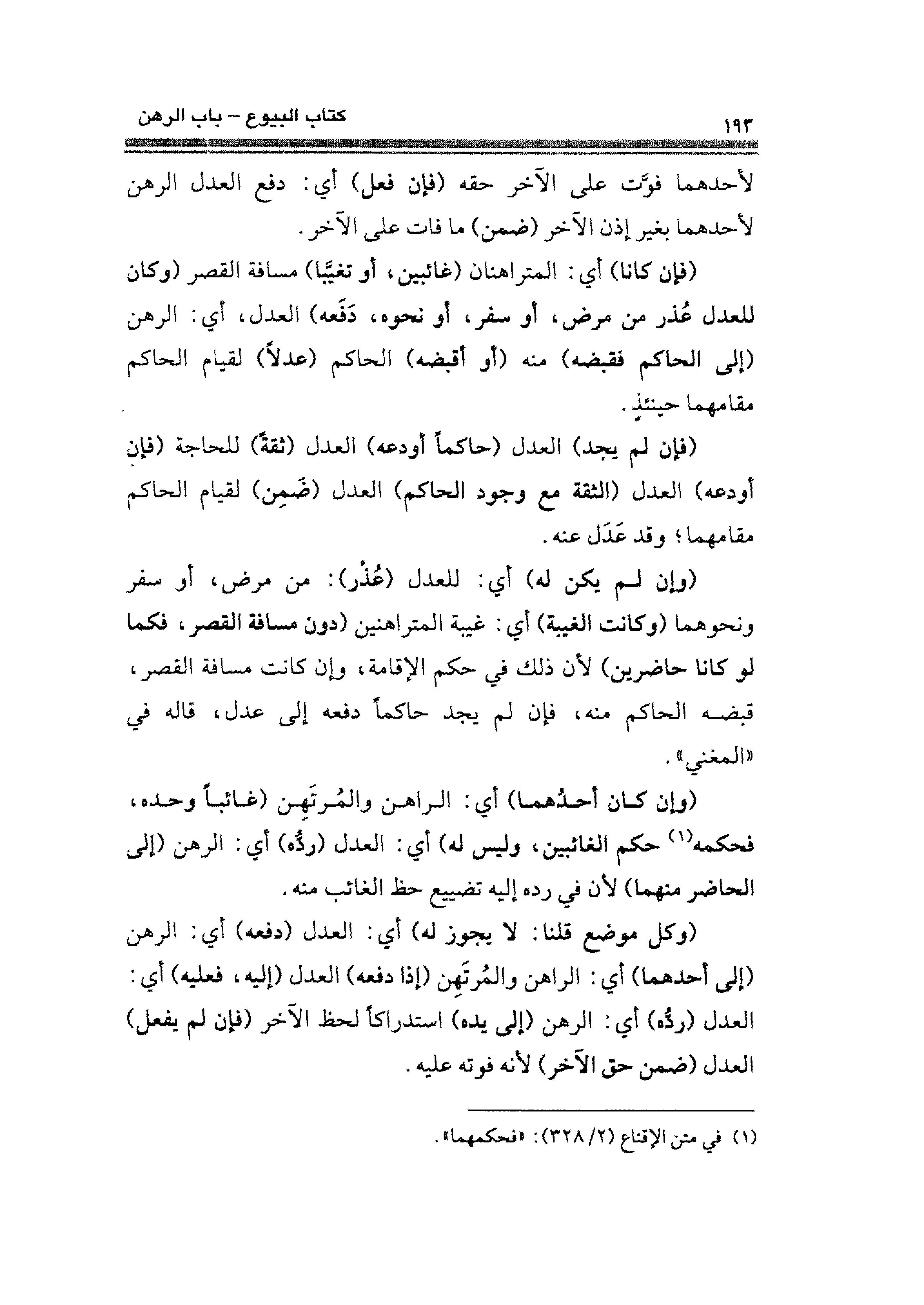 (وكل موضع قلنا: لا يجوز له) أي: العدل (دفعه) أي: الرهن (إلى أحدهما) أي: الراهن والمُرتَهِن (إذا دفعه) العدل (إليه، فعليه) أي: العدل (ردُّه) أي: الرهن (إلى يده) استدركًا لحظ الآخر (فإن لم يفعل) العدل (ضمن حق الآخر) لأنه فوقه عليه.
