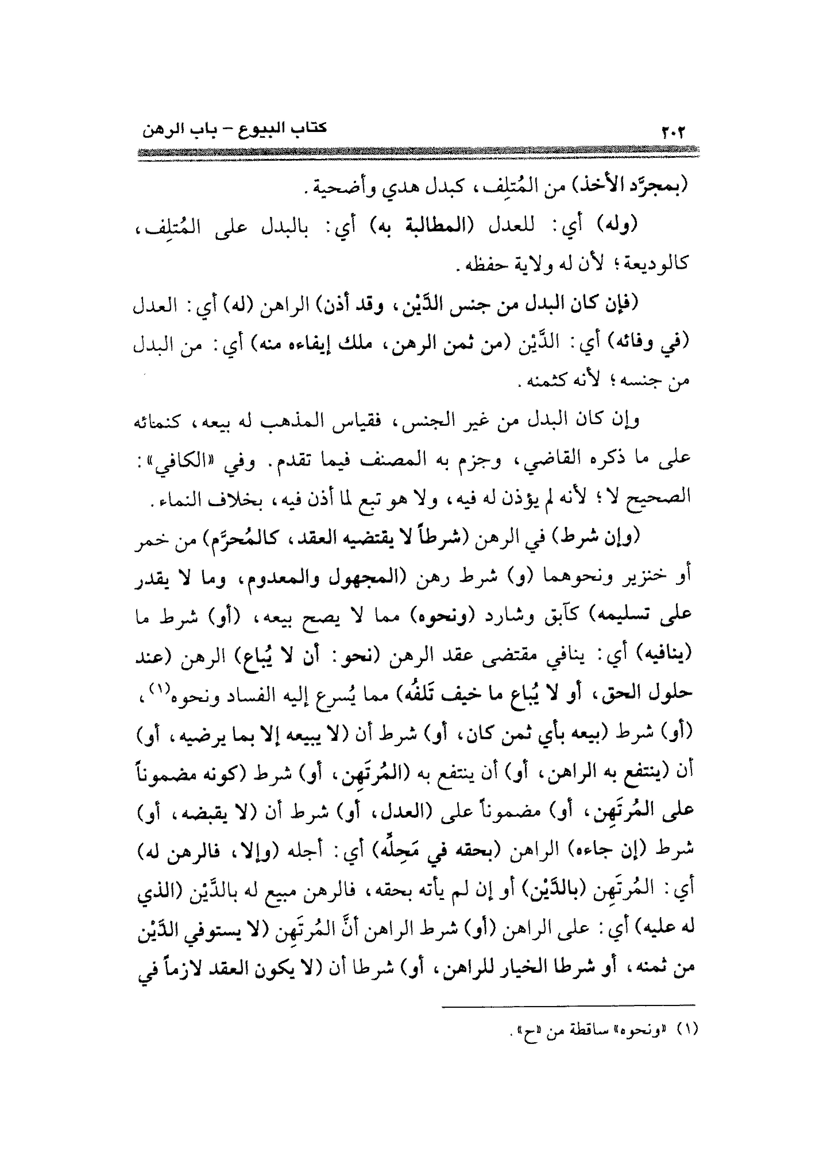 (وإن شرط) فى الرهن (شرطًا لا يقتضيه العقد، كالمُحرَّم) من خمر أو خنزير ونحوهما (و) شرط رهن (المجهول والمعدوم، وما لا يقدر على تسليمه) كآبق وشارد (ونحوه) مما لا يصح بيعه، (أو) شرط ما (ينافيه) أي: ينافي مقتضى عقد الرهن (نحو: أن لا يُباع) الرهن (عند حلول الحق، أو لا يباع ما خيف تَلفُه) مما يُسرع إليه الفساد ونحوه (¬١)، (أو) شرط (بيعه بأي ثمن كان، أو) شرط أن (لا يبيعه إلا بما يرضيه، أو) أن (ينتفع به الراهن، أو) أن ينتفع به (المُرتهن، أو) شرط (كونه مضمونًا على المُرتهن، أو) مضمونًا على (العدل، أو) شرط أن (لا يقبضه، أو) شرط (إن جاءه) الراهن (بحقه في مَحِلِّه) أي: أجله (وإلا، فالرهن له) أي: المُرتهِن (بالدين) أو إن لم يأته بحقه، فالرهن مبيع له بالدَّين (الذى له عليه) أى: على الراهن (أو) شرط الراهن أن المُرتَهِن (لا يستوفي الدَّين من ثمنه، أو شرطا الخيار للراهن، أو) شرطا أن (لا يكون العقد لازمًا في