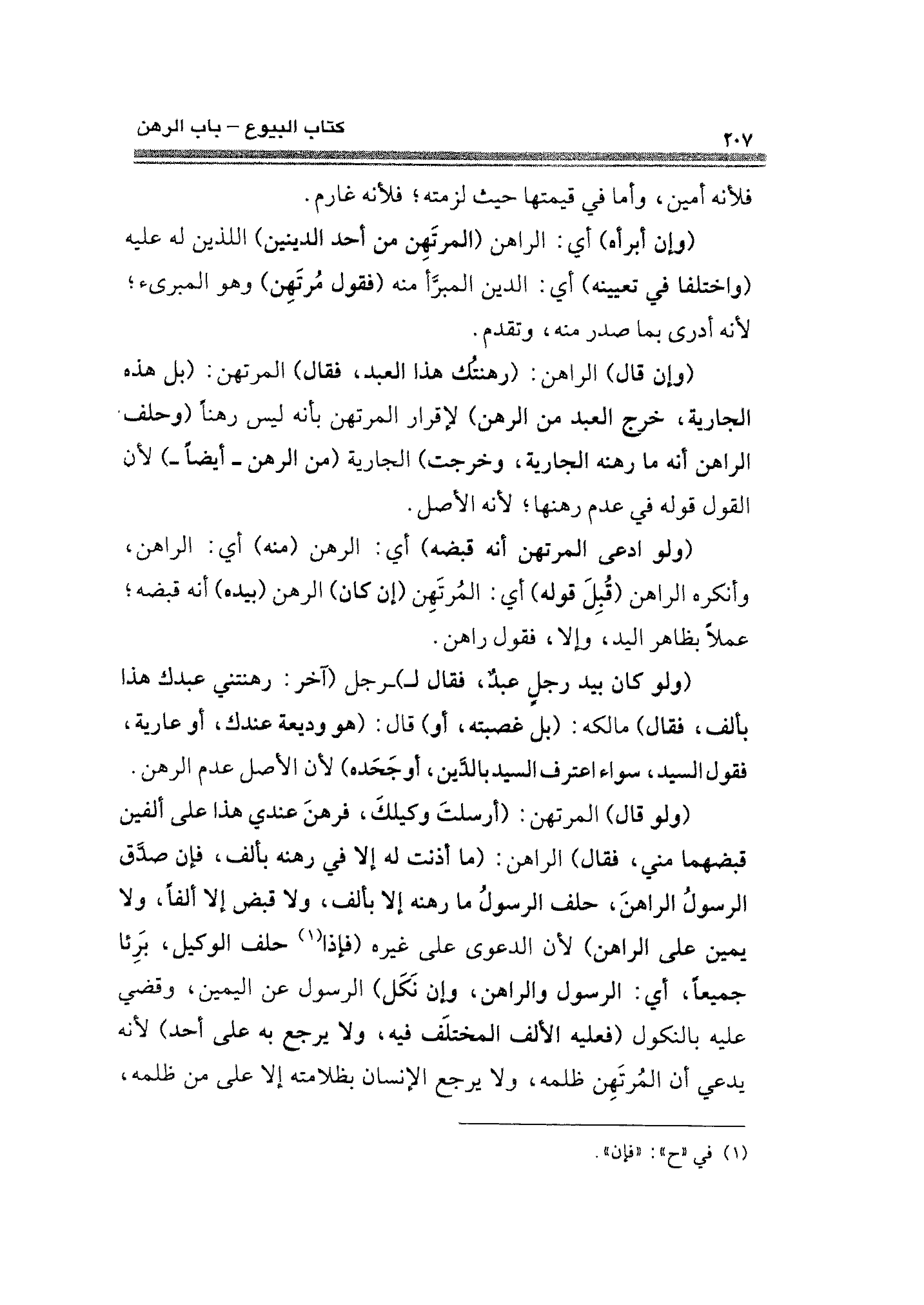 (وإن أبرأه) أي: الراهن (المرتَهِن من أحد الدينين) اللذين له عليه (واختلفا في تعيينه) أي: الدين المبرَّأ صته (فقول مُرتَهِن) وهو المبرئ؛ لأنه أدرى بما صدر منه، وتقدم.