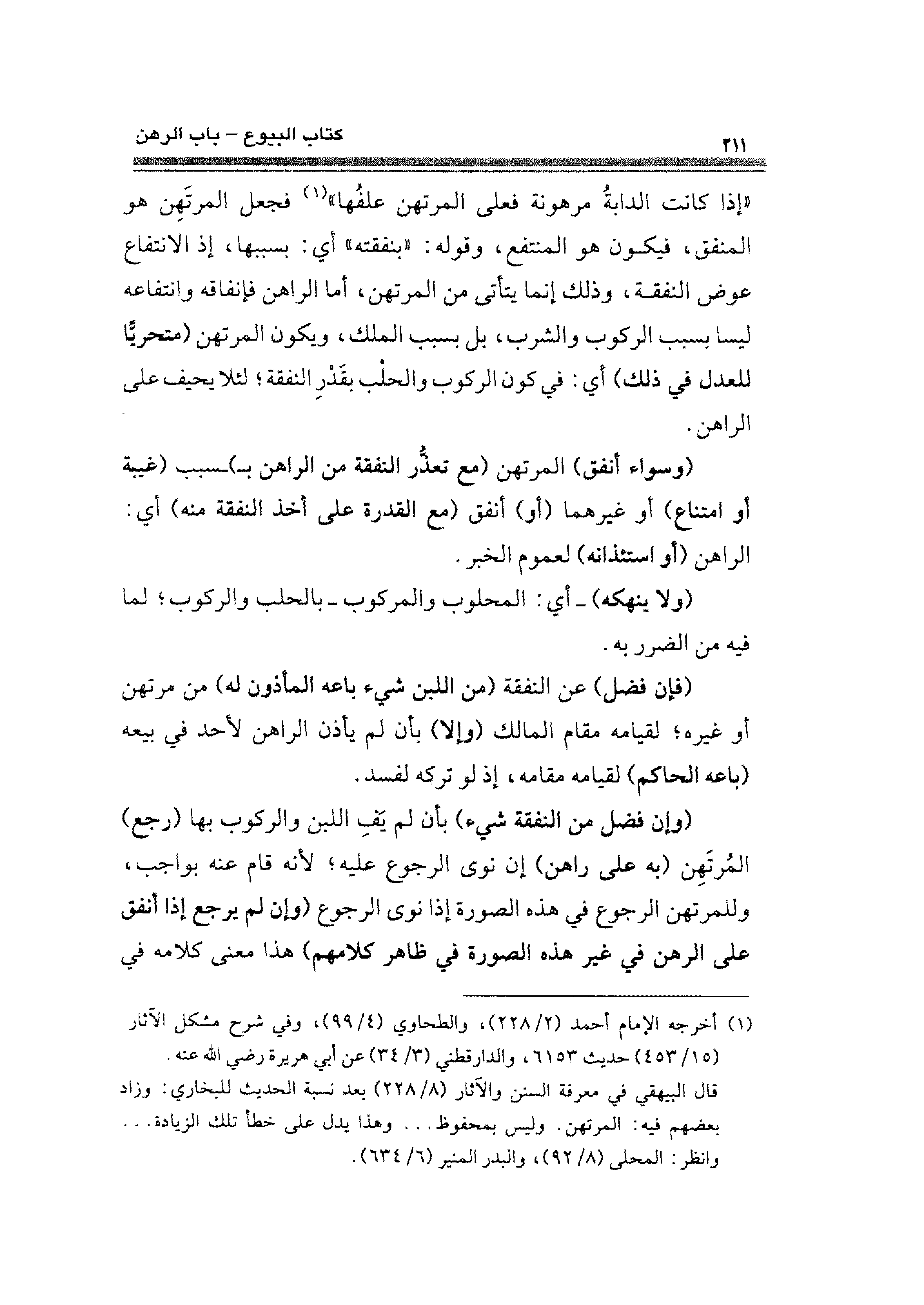 "إذا كانت الدابةُ مرهونة فعلى المرتهن علفُها" (¬١) فجعل المرتَهِن هو المنفق، فيكون هو المنتفع، وقوله: "بنفقته" أي": بسببها، إذ الانتفاع عوض النفقة، وذلك إنما يتأتى من المرتهن، أما الراهن فإنفاقه وانتفاعه ليسا بسبب الركوب والشرب، بل بسبب الملك، ويكون المرتهن (متحريًّا للعدل في ذلك) أي: في كون الركوب والحلْب بقَدرِ النفقة؛ لئلا يحيف على الراهن.