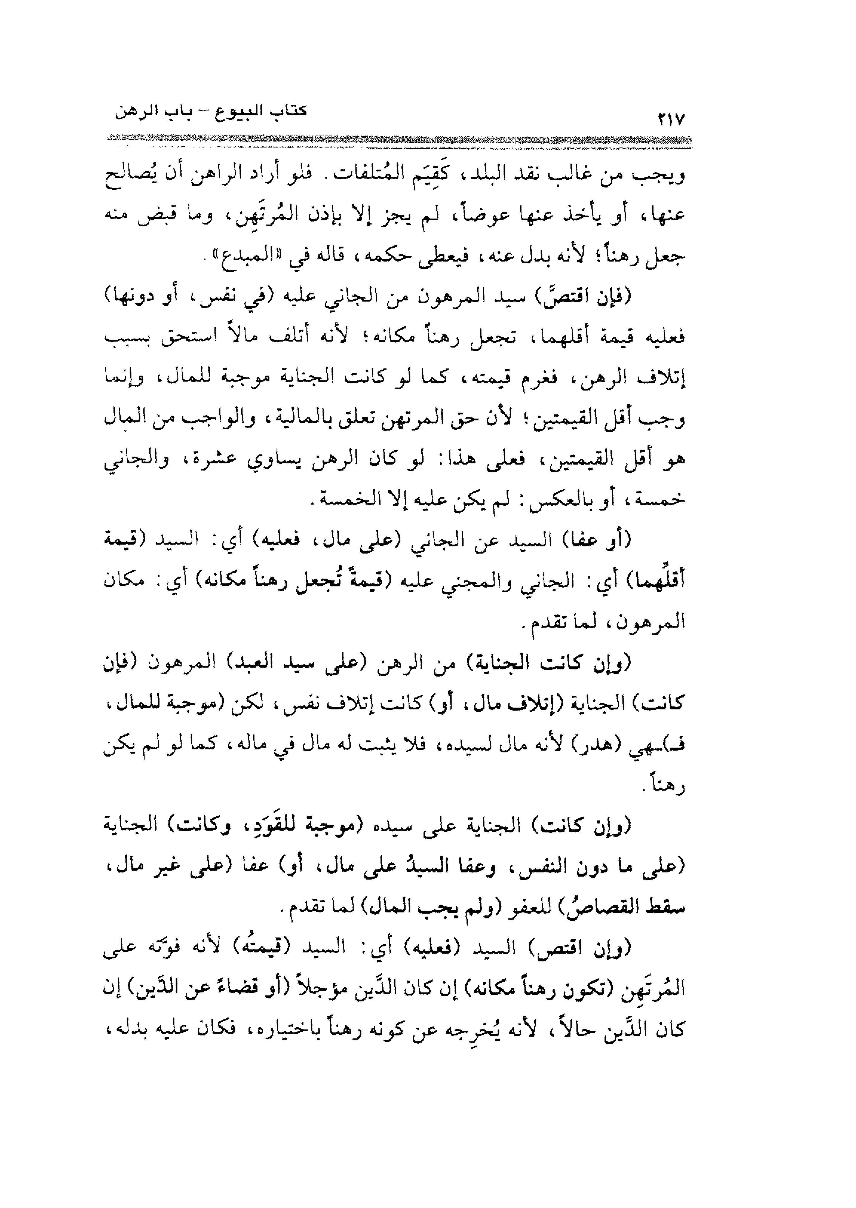 (فإن اقتصَ) سيد المرهون من الجاني عليه (في نفس، أو دونها) فعليه قيمة أقلهما، تجعل رهنًا مكانه؛ لأنه أتلف مالًا استحق بسبب إتلاف الرهن، فغرم قيمته، كما لو كانت الجناية موجبة للمال، وإنما وجب أقل القيمتين؛ لأن حق المرتهن تعلق بالمالية، والواجب من المال هو أقل القيمتين، فعلى هذا: لو كان الرهن يساوي عشرة، والجاني خمسة، أو بالعكس: لم يكن عليه إلا الخمسة.