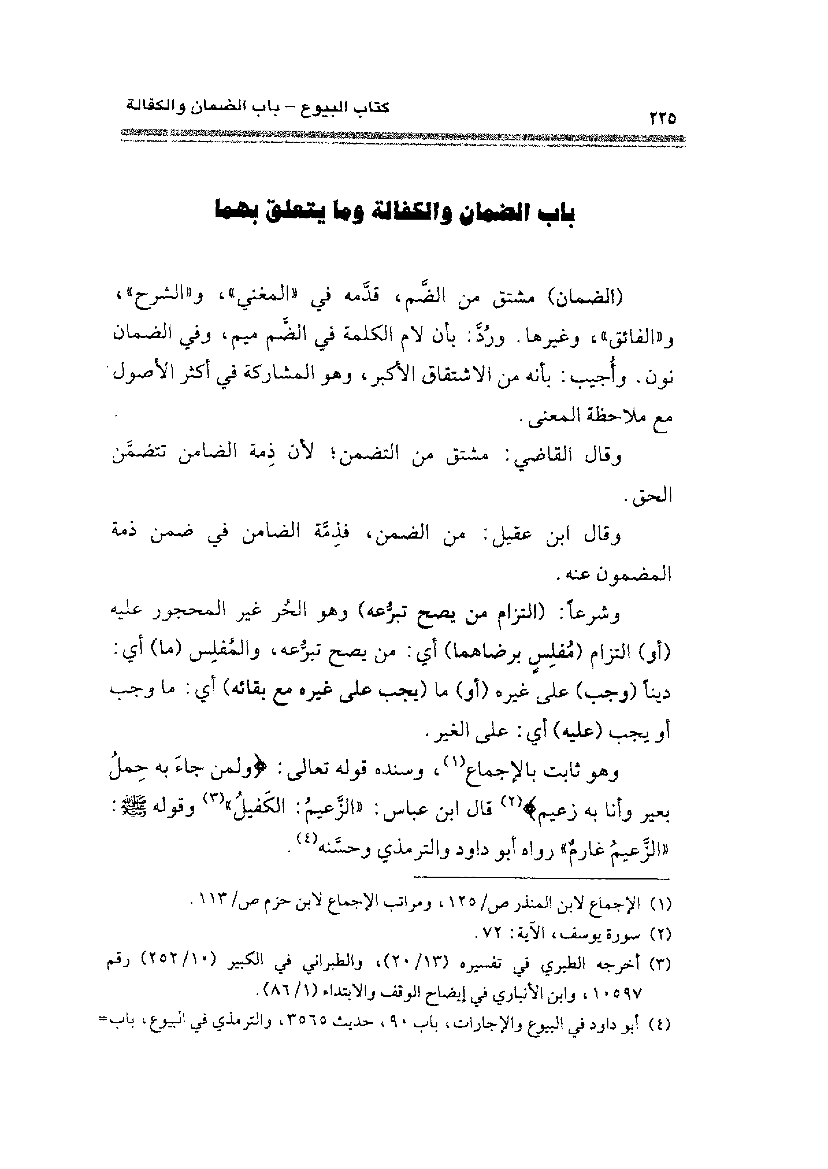 وهو ثابت بالإجماع (¬١)، وسنده قوله تعالى: {وَلِمَنْ جَاءَ بِهِ حِمْلُ بَعِيرٍ وَأَنَا بِهِ زَعِيمٌ} (¬٢) قال ابن عباس: "الزَّعيم: الكَفيلُ" (¬٣) وقوله - صلى الله عليه وسلم -: "الزَّعيمُ غارمٌ" رواه أبو داود والترمذي وحسَّنه (¬٤).