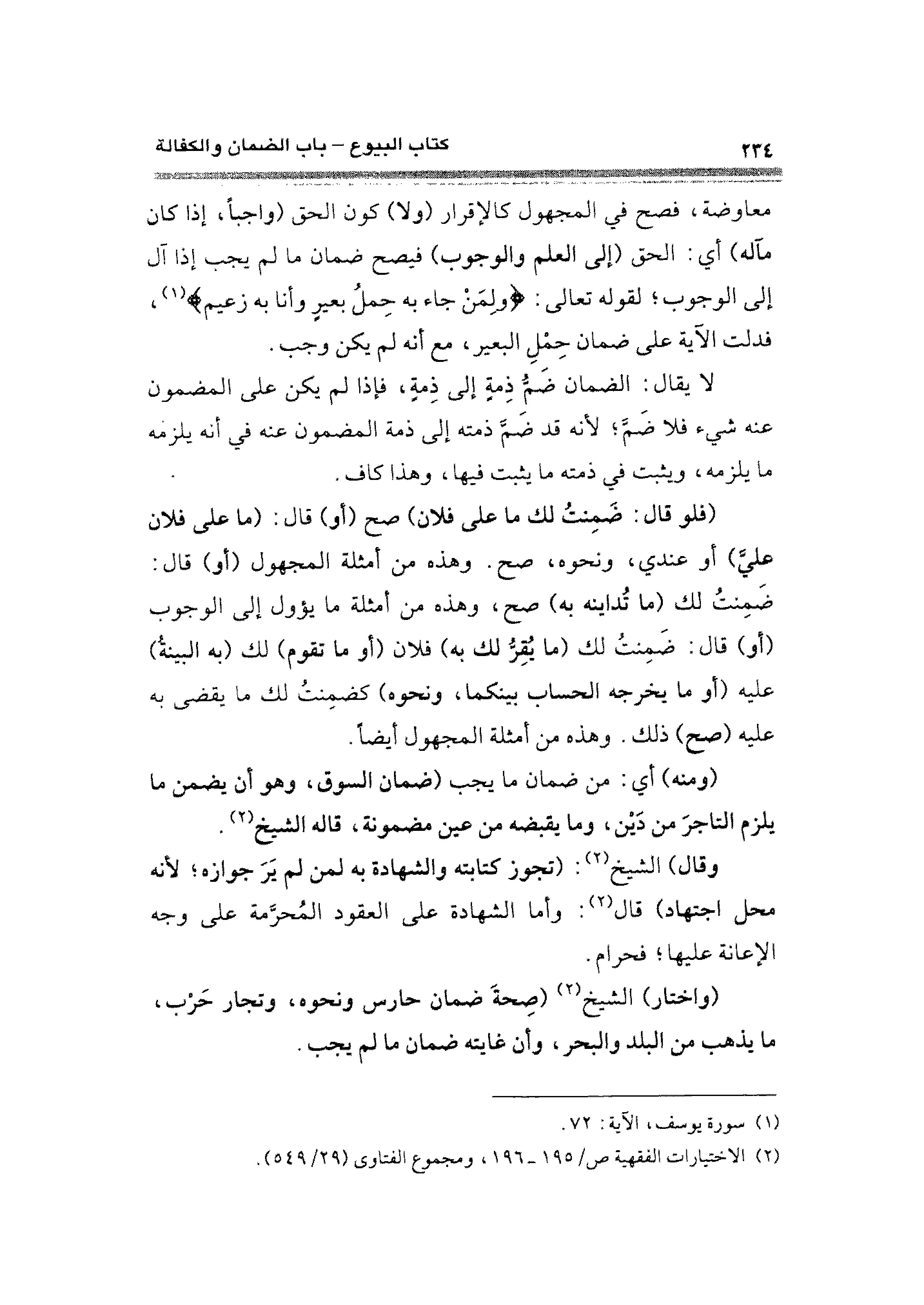 معاوضة، فصح في المجهول كالإقرار (ولا) كون الحق (واجبًا، إذا كان مآله) أي: الحق (إلى العلم والوجوب) فيصح ضمان ما لم يجب إذا آل إلى الوجوب؛ لقوله تعالى: {ولِمَنْ جَاءَ بِهِ حِمْلُ بَعِيرٍ} (¬١)، فدلت الآية على ضمان حِملِ البعير، مع أنه لم يكن وجب.