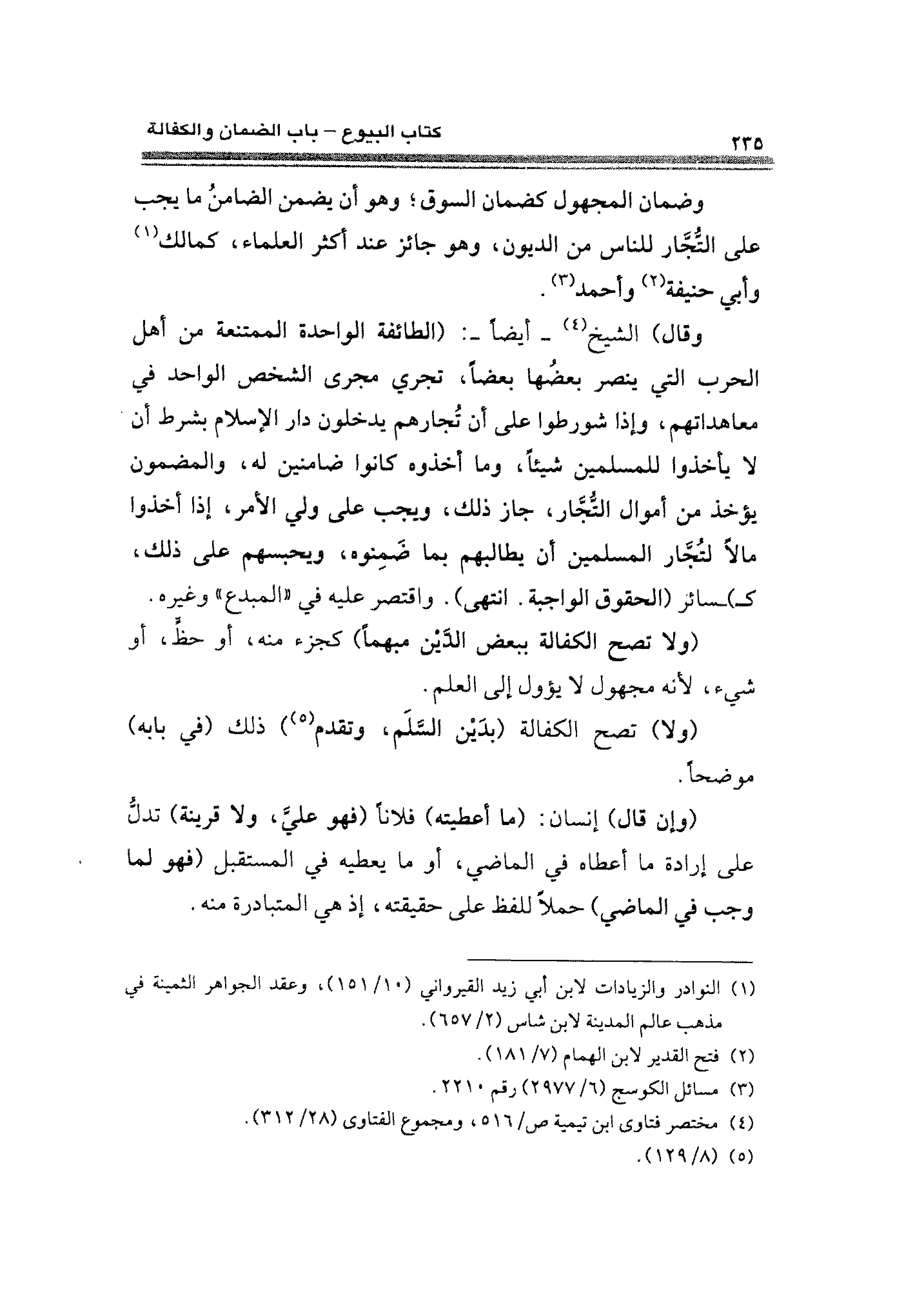 وقال) الشيخ (¬٤) -أيضًا-: (الطائفة الواحدة الممتنعة من أهل الحرب التي ينصر بعضُها بعضًا، تجري مجرى الشخص الواحد في معاهداتهم، وإذا شورطوا على أن تُجارهم يدخلون دار الإسلام بشرط أنْ لا يأخذوا للمسلمين شيئًا، وما أخذوه كانوا ضامنين له، والمضمون يؤخذ من أموال التجار، جاز ذلك، ويجب على ولي الأمر، إذا أخذوا مالًا لتجار المسلمين أن يطالبهم بما ضَمِنوه، ويحبسهم على ذلك، كـ) سائر (الحقوق الواجبة. انتهى). واقتصر عليه في "المبدع" وغيره.