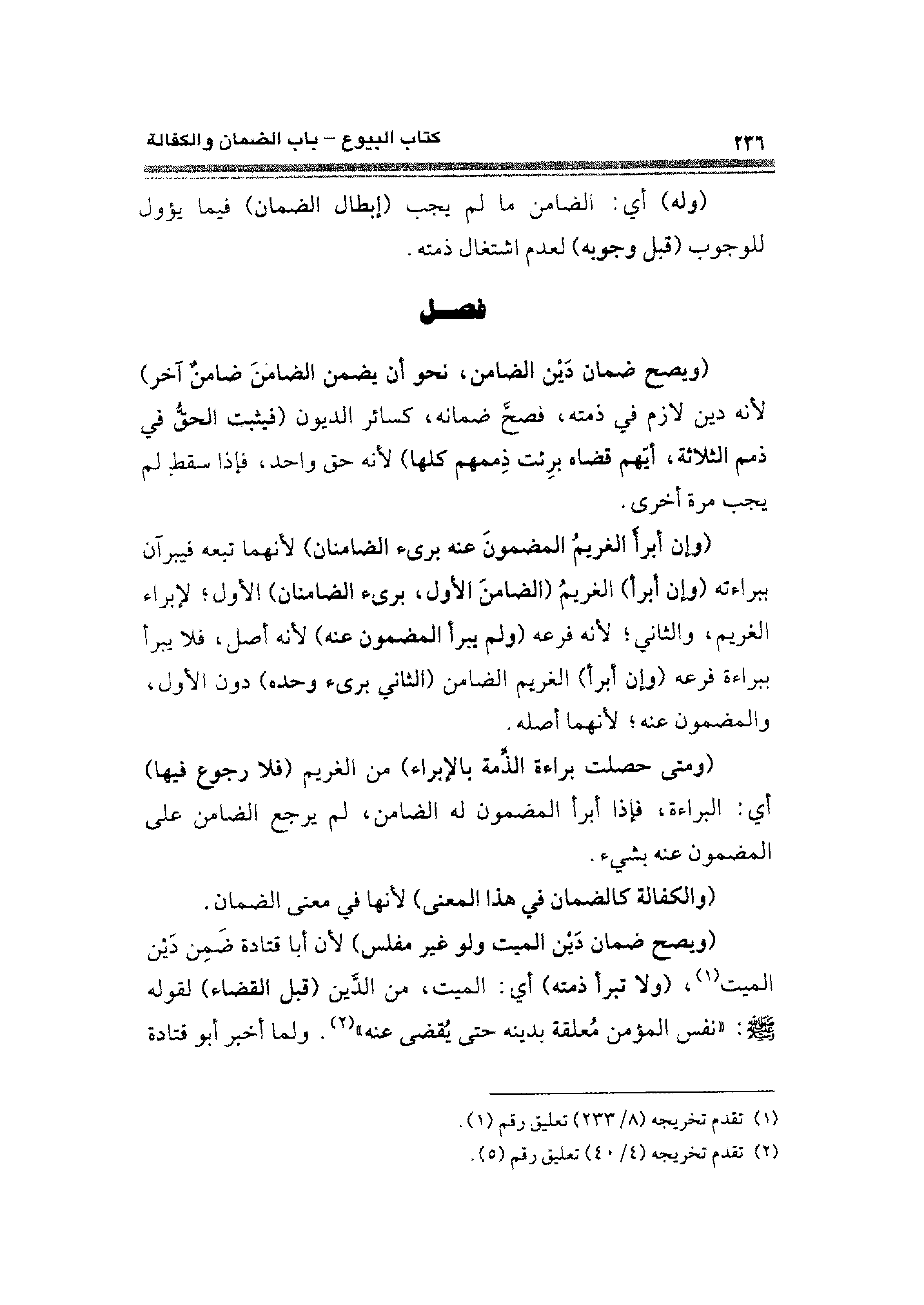 (ويصح ضمان دَيْن الضامن، نحو أن يضمن الضامنَ ضامن آخر) لأنه دين لازم في ذمته، فصحّ ضمانه، كسائر الديون (فيثبت الحق في ذمم الثلاثة، أيهم قضاه برِئت ذممهم كلها) لأنه حق واحد، فإذا سقط لم يجب مرة أخرى.