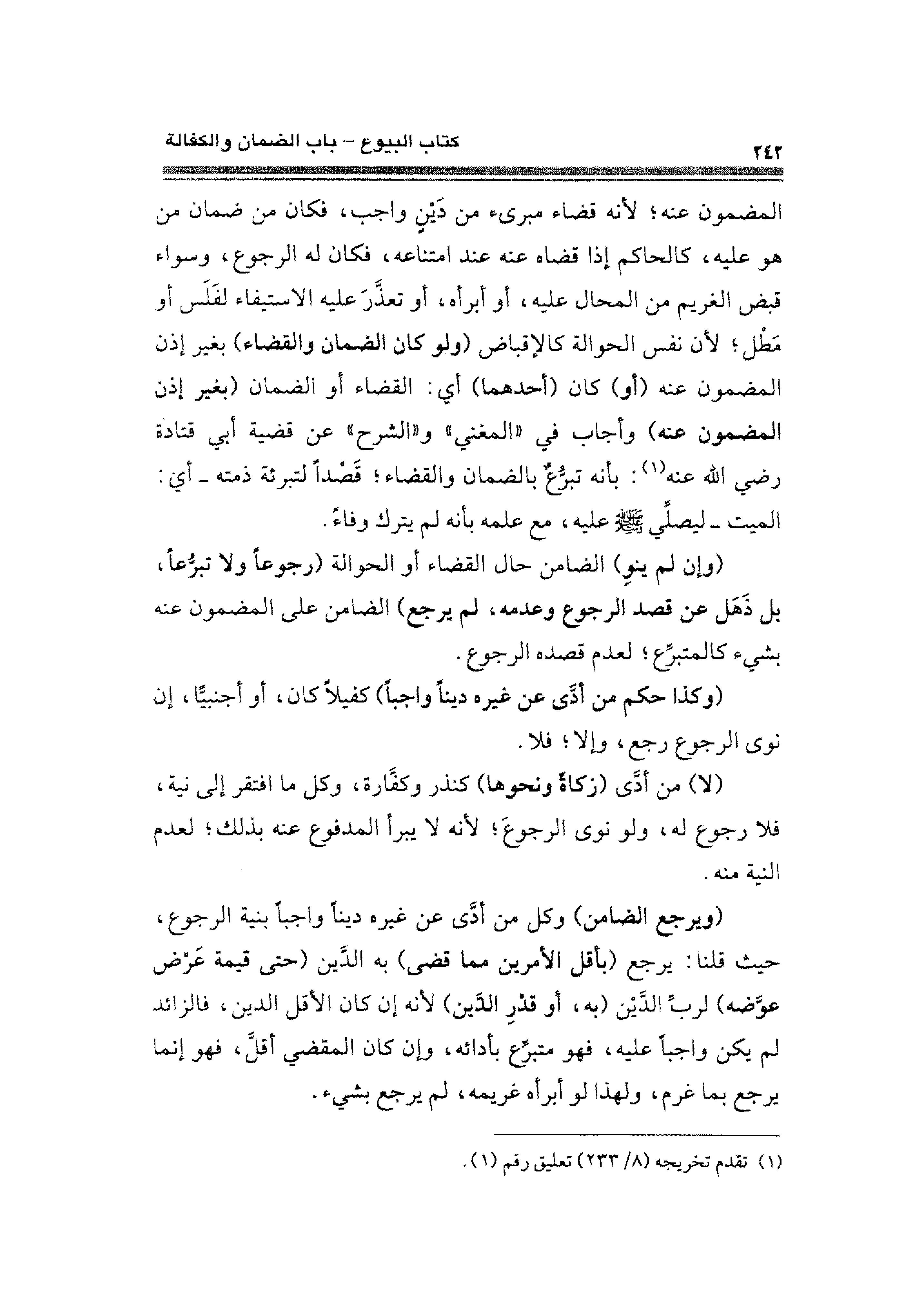 (وكذا حكم من أدَّى عن غيره دينًا واجبًا) كفيلًا كان، أو أجنبيًّا، إن نوى الرجوع رجع، وإلا؛ فلا.