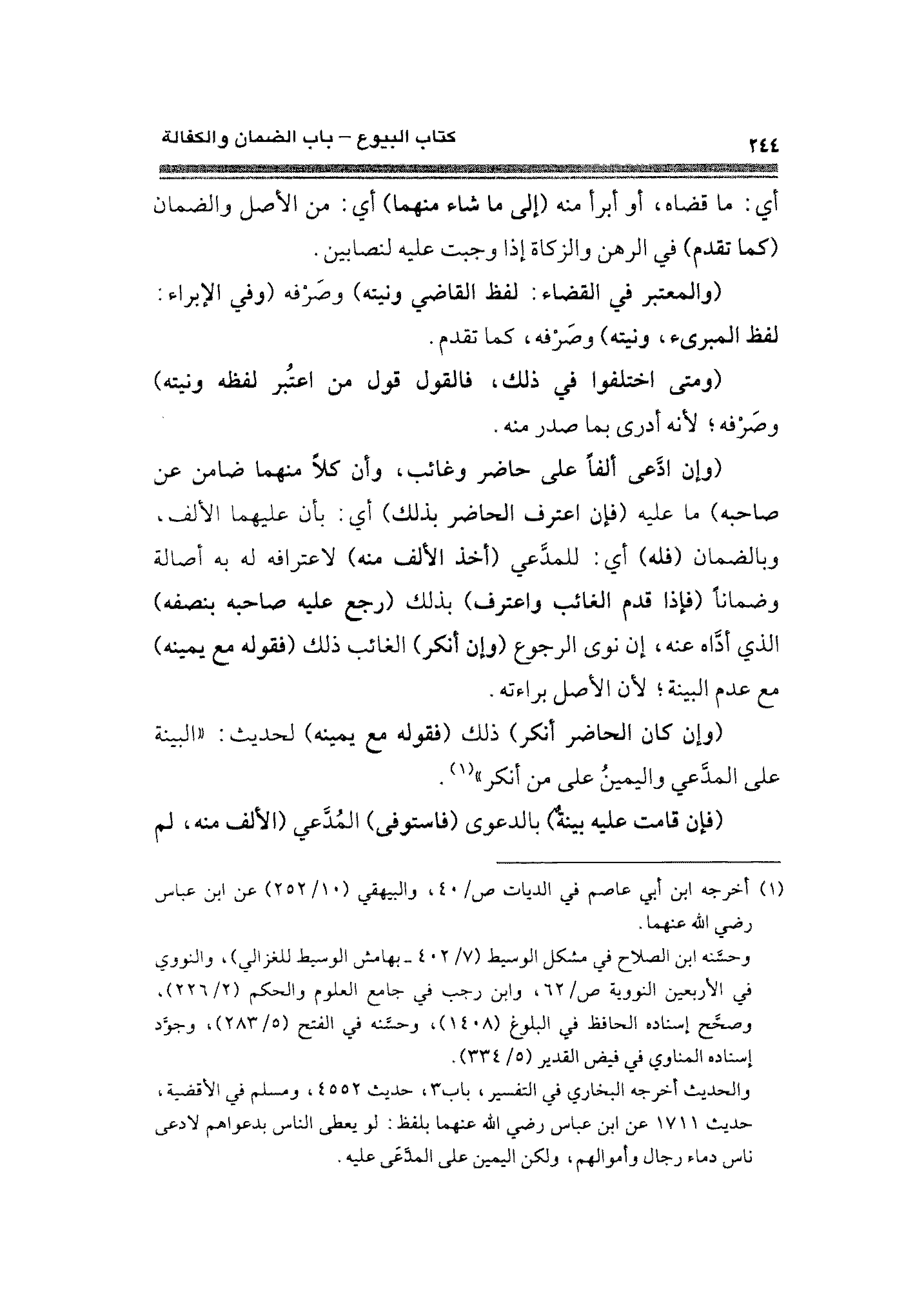 والحديث أخرجه البخاري في التفسير، باب ٣، حديث ٥٤٤٢، ومسلم في الأقضية، حديث ١٧١١ عن ابن عباس رضي الله عنهما بلفظ: لو يعطى الناس بدعواهم لادعى ناس دماء رجال وأموالهم، ولكن اليمين على المدعى عليه.