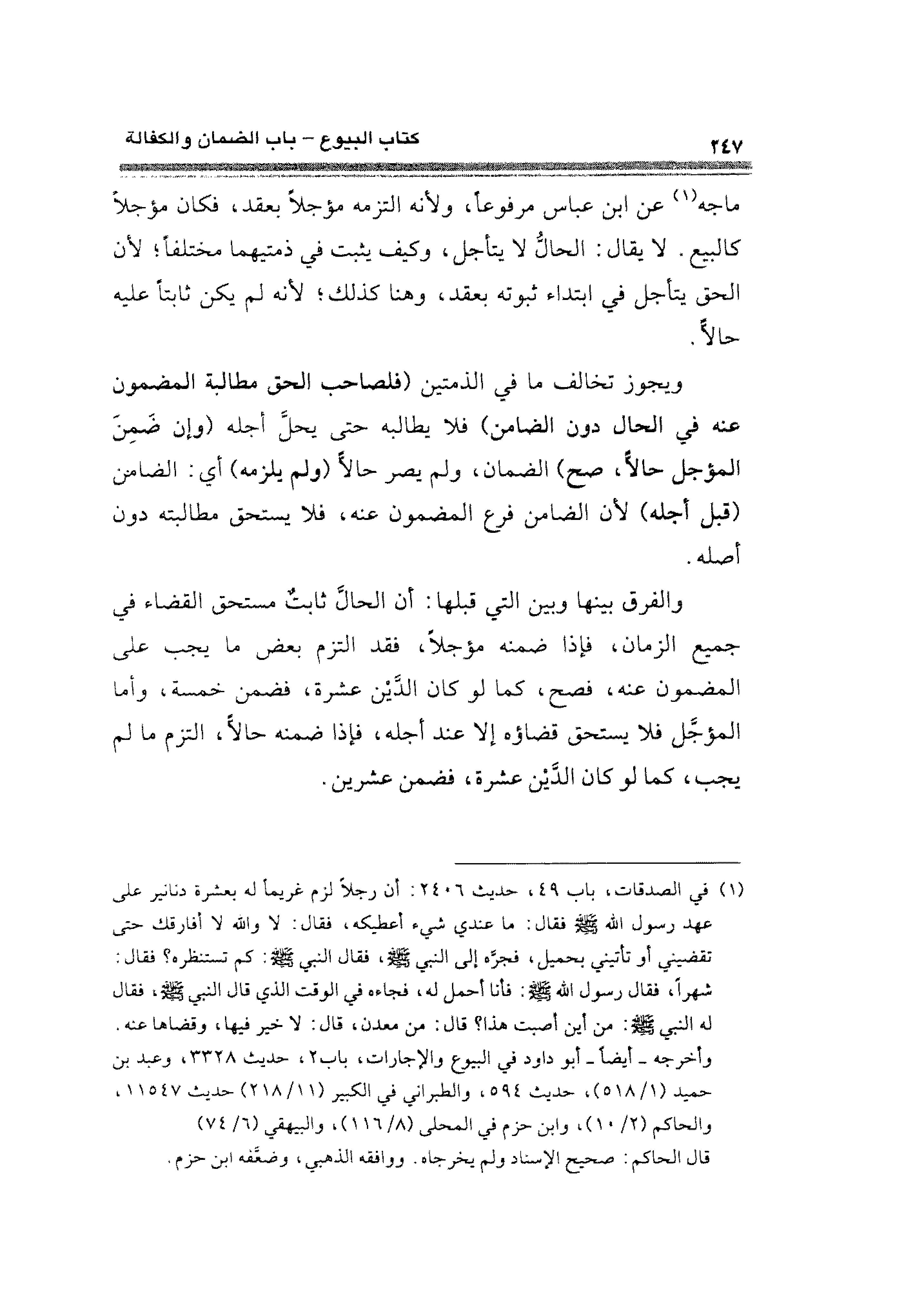 والفرق بينها وبين التي قبلها: أن الحالَّ ثابتٌ مستحق القضاء في جميع الزمان، فإذا ضمنه مؤجلًا، فقد التزم بعض ما يجب على المضمون عنه، فصح، كما لو كان الدَّين عشرة، فضمن خمسة، وأما المؤجَّل فلا يستحق قضاؤه إلا عند أجله، فإذا ضمنه حالًّا، التزم ما لم يجب، كما لو كان الدَّين عشرة، فضمن عشرين.