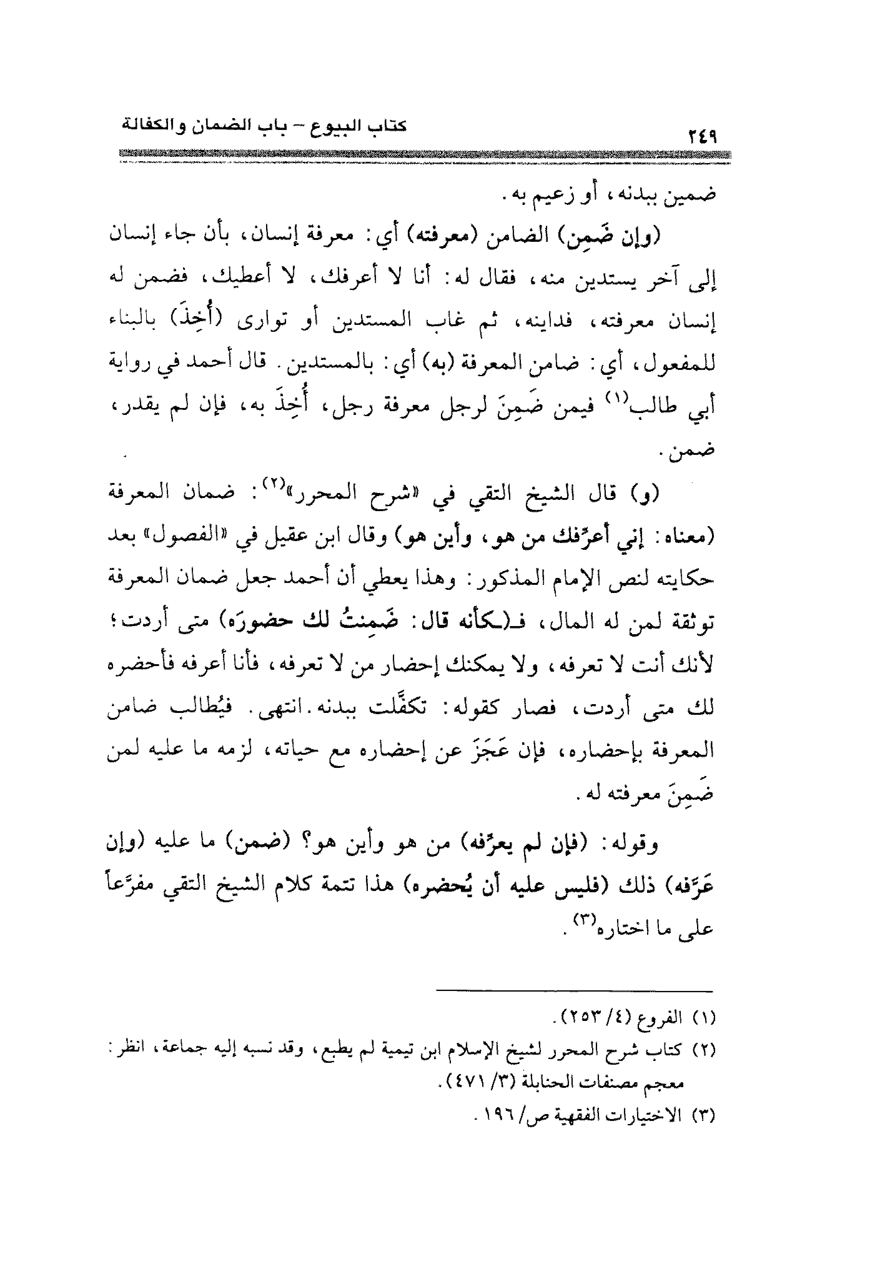 (و) قال الشيخ التقي في "شرح المحرر" (¬٢): ضمان المعرفة (معناه: إني أعرِّفك من هو، وأين هو) وقال ابن عقيل في "الفصول" بعد حكايته لنص الإمام المذكور: وهذا يعطي أن أحمد جعل ضمان المعرفة توثقة لمن له المال، فـ (ـكأنه قال: ضَمِنتُ لك حضورَه) متى أردت؛ لأنك أنت لا تعرفه، ولا يمكنك إحضار من لا تعرفه، فأنا أعرفه فأحضره لك متى أردت، فصار كقوله: تكفَّلت ببدنه. انتهى. فيُطالب ضامن المعرفة بإحضاره، فإن عَجَزَ عن إحضاره مع حياته، لزمه ما عليه لمن ضَمِنَ معرفته له.
