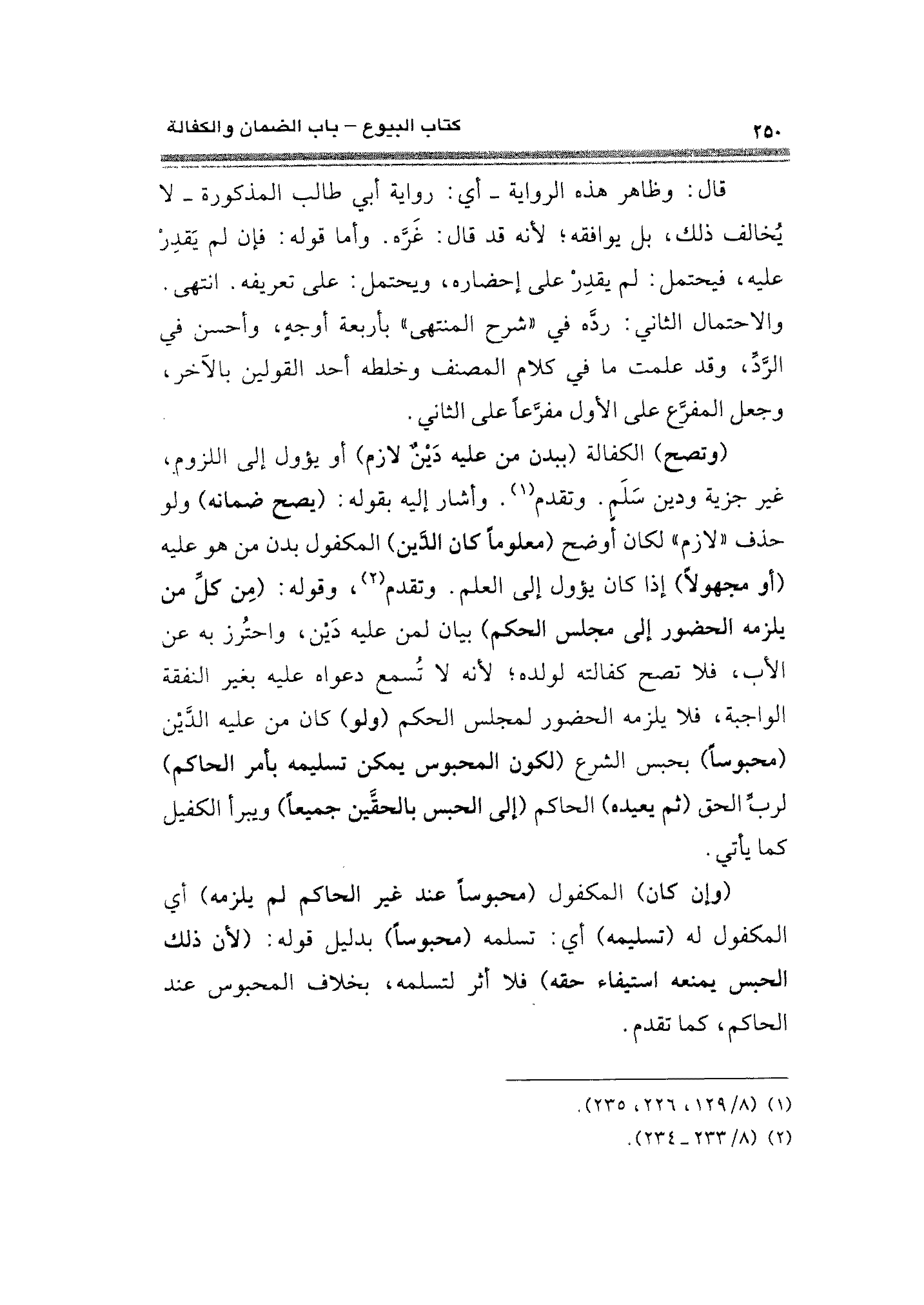 (وتصح) الكفالة (ببدن من عليه دَينٌ لازم) أو يؤول إلى اللزوم، غير جزية ودين سَلَمٍ. وتقدم (¬١). وأشار إليه بقوله: (يصح ضمانه) ولو حذف "لازم" لكان أوضح (معلومًا كان الدَّين) المكفول بدن من هو عليه (أو مجهولًا) إذا كان يؤول إلى العلم. وتقدم (¬٢)، وقوله: (مِن كل من يلزمه الحضور إلى مجلس الحكم) بيان لمن عليه دَين، واحتُرز به عن الأب، فلا تصح كفاله لولده؛ لأنه لا تُسمع دعواه عليه بغير النفقة الواجبة؛ فلا يلزمه الحضور لمجلس الحكم (ولو) كان من عليه الدَّين (محبوسًا) بحبس الشرع (لكون المحبوس يمكن تسليمه بأمر الحاكم) لربِّ الحق (ثم يعيده) الحاكم (إلى الحبس بالحقَّين جميعًا) ويبرأ الكفيل كما يأتي.