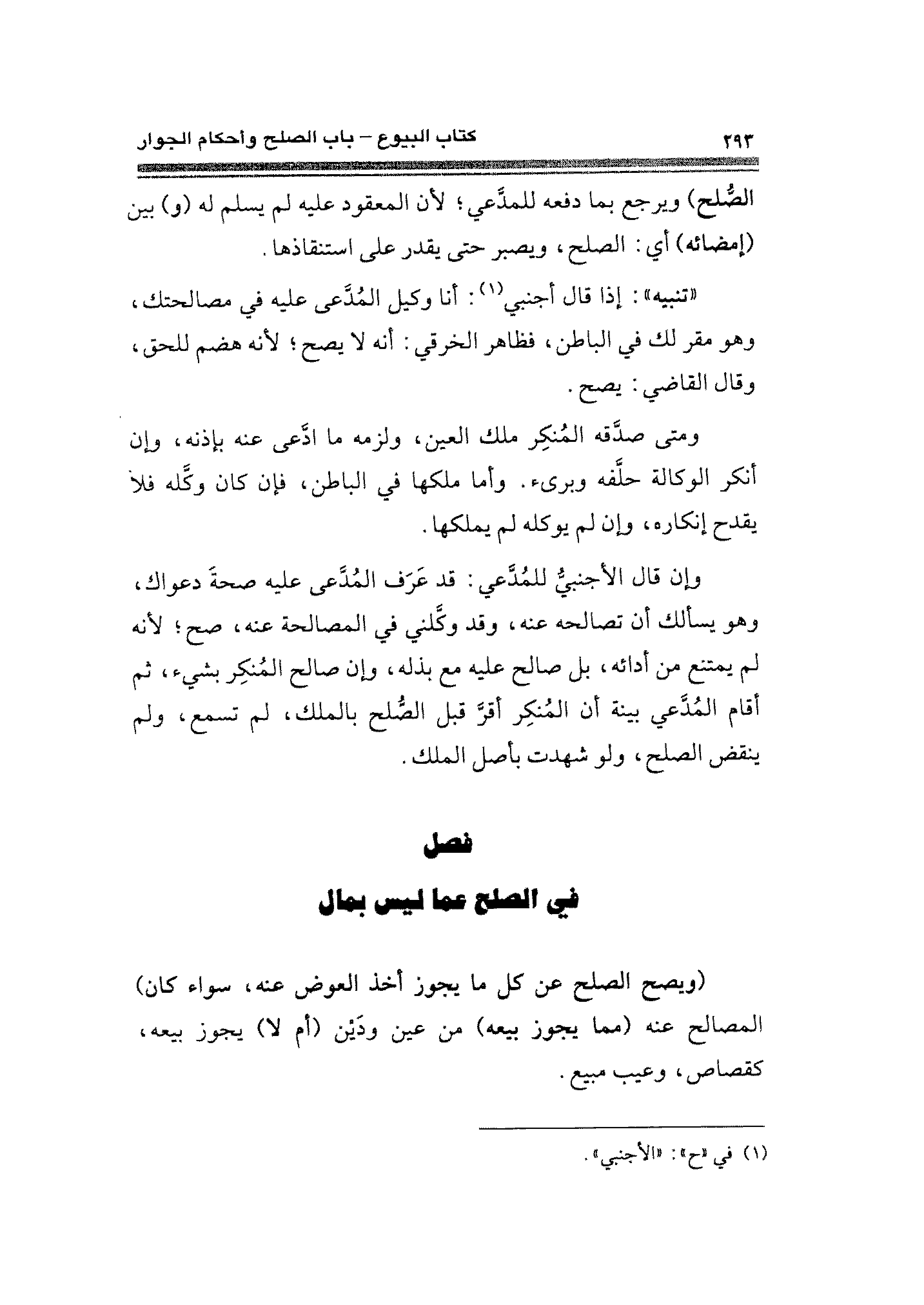 "تنبيه": إذا قال أجنبي (¬١): أنا وكيل المُدعى عليه في مصالحتك، وهو مقر لك في الباطن، فظاهر الخرقي: أنه لا يصح؛ لأنه هضم للحق، وقال القاضي: يصح.