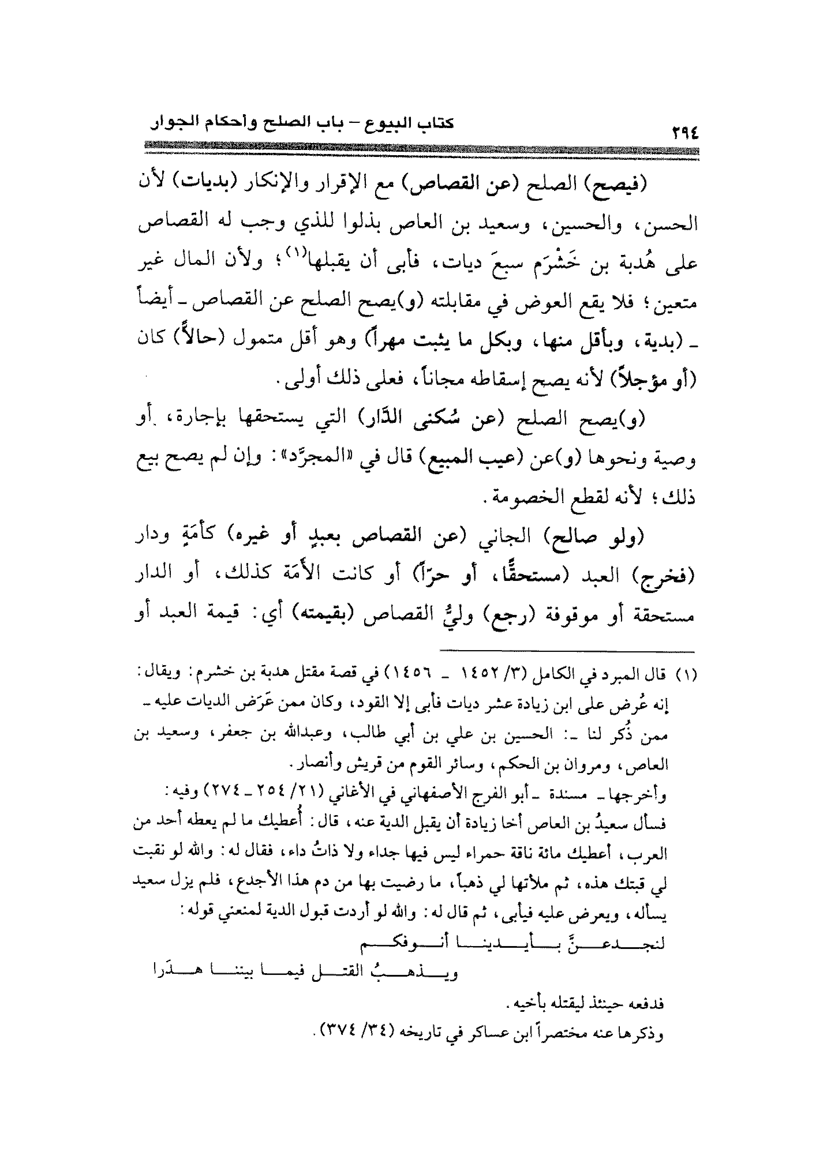 (¬١) قال المبرد في الكامل (٣/ ١٤٥٢ - ١٤٥٦) في قصة مقتل هدبة بن خشرم: ويقال: إنه عُرض على ابن زيادة عشر ديات فأبى إلا القود، وكان ممن عَرَض الديات عليه -ممن ذُكر لنا-: الحسين بن علي بن أبي طالب، وعبد الله بن جعفر، وسعيد بن العاص، ومروان بن الحكم، وسائر القوم من قريش وأنصار.