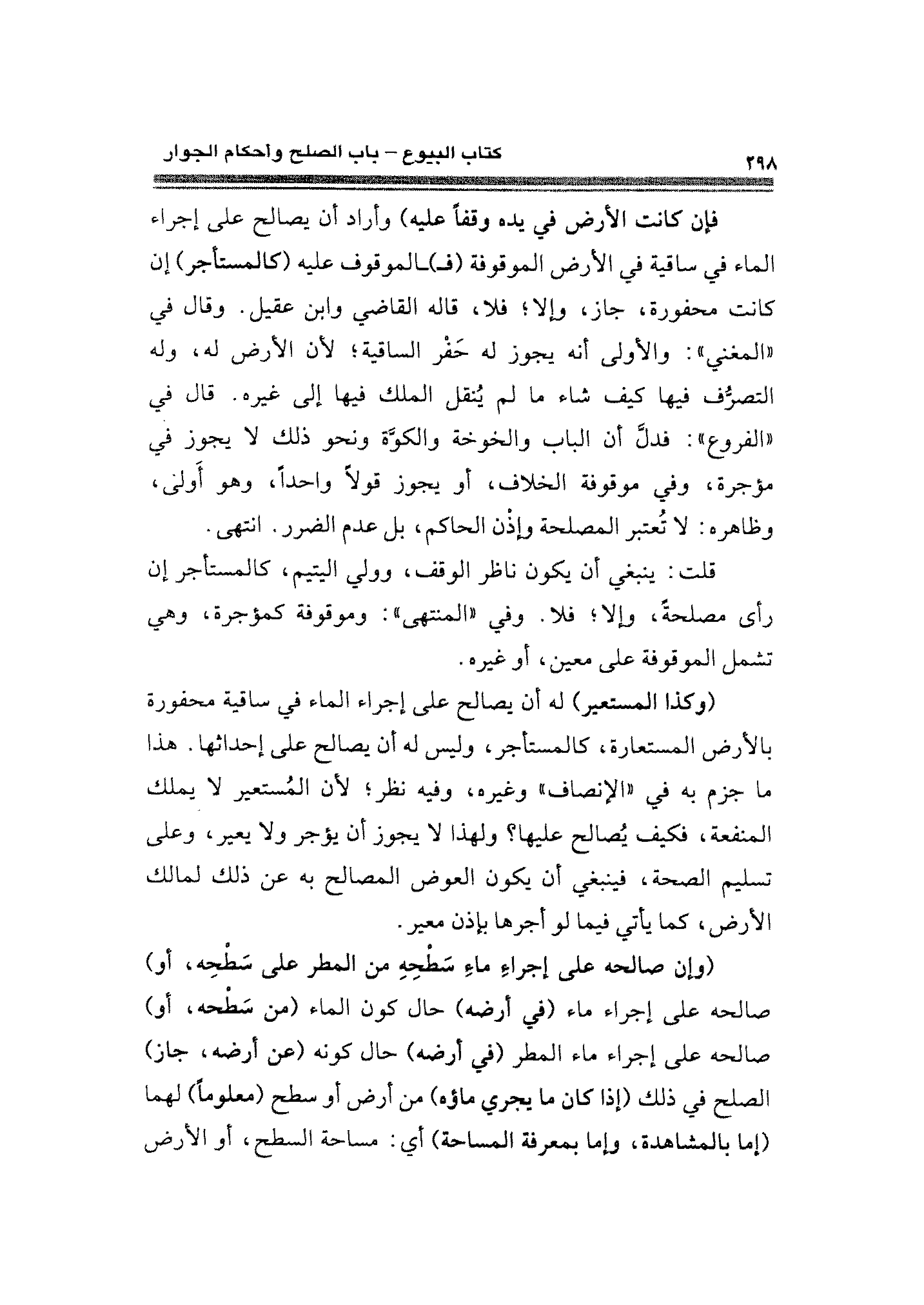 فإن كانت الأرض في يده وقفًا عليه) وأراد أن يصالح على إجراء الماء في ساقية في الأرض الموقوفة (فـ) ـالموقوف عليه (كالمستأجر) إن كانت محفورة، جاز، وإلا؛ فلا، قاله القاضي وابن عقيل. وقال في "المغني": والأولى أنه يجوز له حَفْر الساقية؛ لأن الأرض له، وله التصرُّف فيها كيف شاء ما لم يُنقل الملك فيها إلى غيره. قال في "الفروع": فدلَّ أن الباب والخوخة والكوَّة ونحو ذلك لا يجوز في مؤجرة، وفي موقوفة الخلافَ، أو يجوز قولًا واحدًا، وهو أَولى، وظاهره: لا تُعتبر المصلحة وإذْن الحاكم، بل عدم الضرر. انتهى.