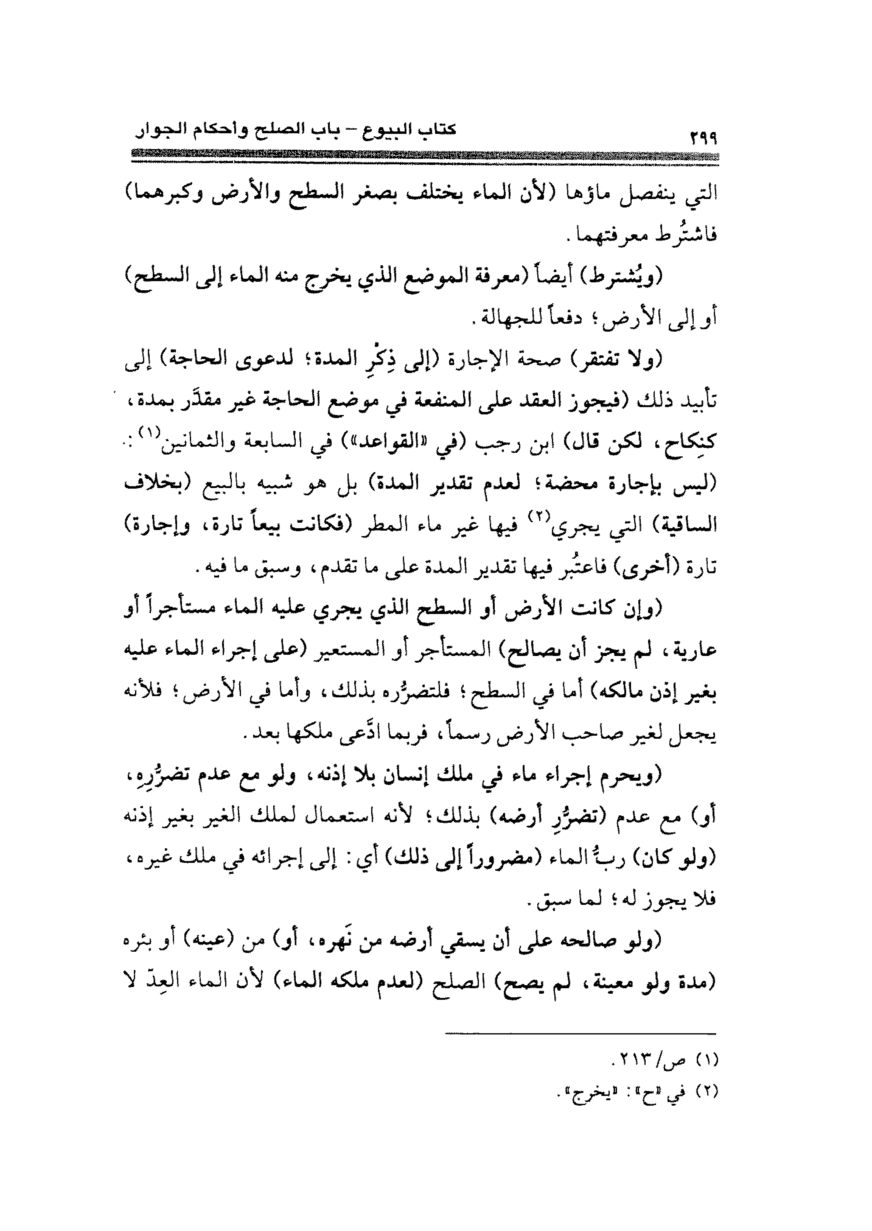 (وإن كانت الأرض أو السطح الذي يجري عليه الماء مستأجرًا أو عارية، لم يجز أن يصالح) المستأجر أو المستعير (على إجراء الماء عليه بغير إذن مالكه) أما في السطح؛ فلتضرُّره بذلك، وأما في الأرض؛ فلأنه يجعل لغير صاحب الأرض رسمًا، فربما ادَّعى ملكها بعد.