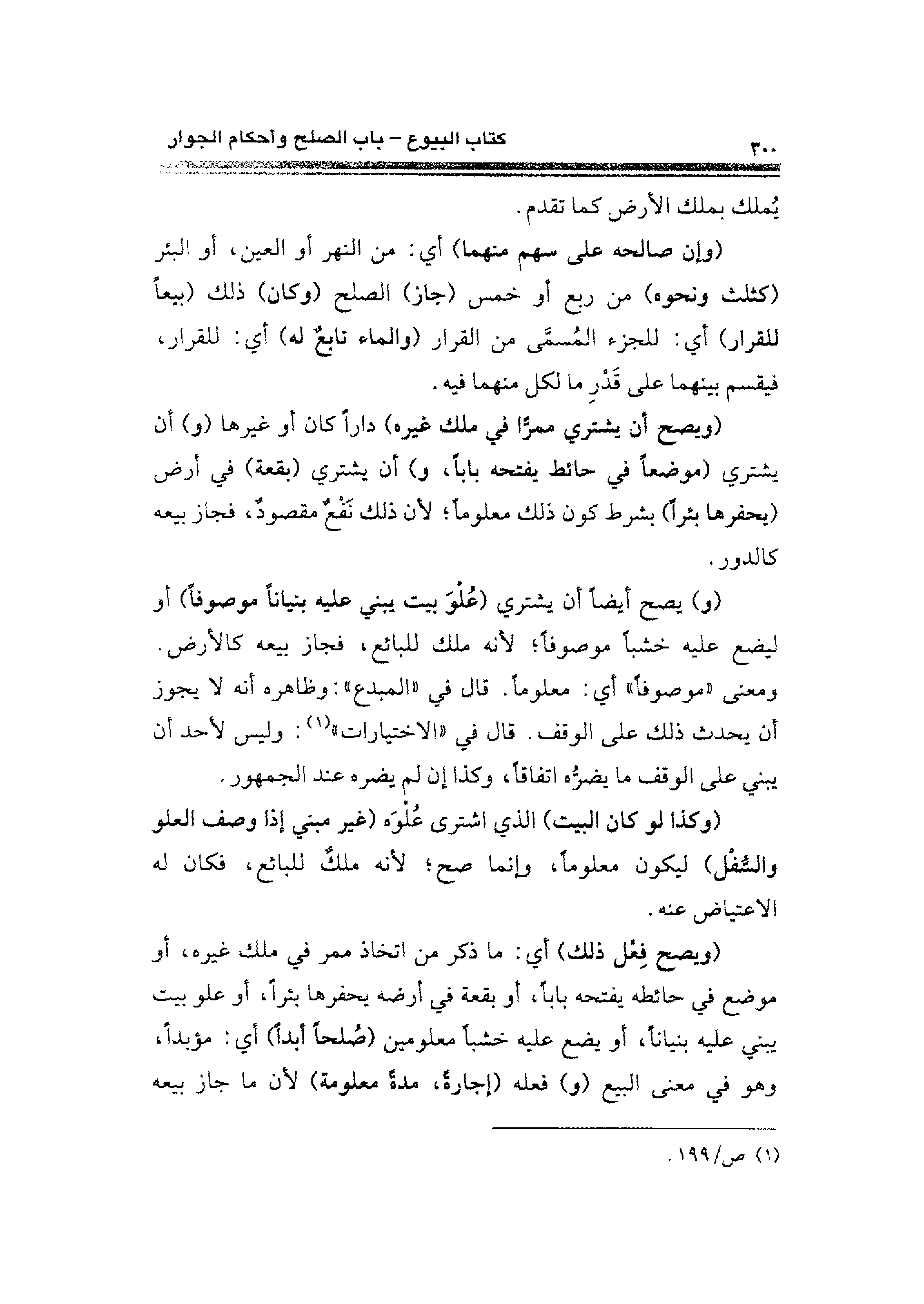 (و) يصح أيضًا أن يشتري (عُلْوَ بيت يبني عليه بنيانًا موصوفًا) أو ليضع عليه خشبًا موصوفًا؛ لأنه ملك للبائع، فجاز بيعه كالأرض. ومعني "موصوفًا" أي: معلومًا. قال في "المبدع": وظاهره أنه لا يجوز أن يحدث ذلك على الوقف. قال في "الاختيارات" (¬١): وليس لأحد أن يبني على الوقف ما يضرُّه اتفاقا، وكذا إن لم يضره عند الجمهور.