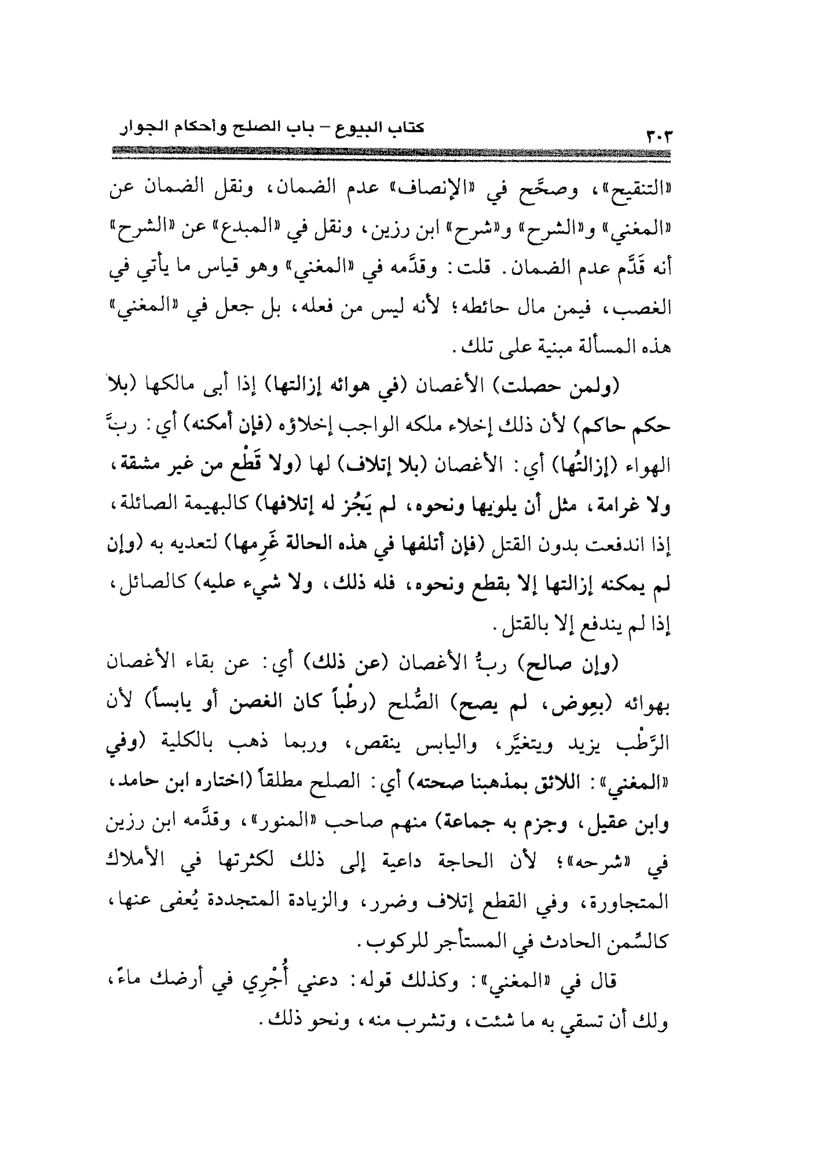 (وإن صالح) ربُّ الأغصان (عن ذلك) أي: عن بقاء الأغصان بهوائه (بعِوض، لم يصح) الصُّلح (رطْبًا كان الغصن أو يابسًا) لأن الرَّطب يزيد ويتغيَّر، واليابس ينقص، وربما ذهب بالكلية (وفي "المغني": اللائق بمذهبنا صحته) أي: الصلح مطلقًا (اختاره ابن حامد، وابن عقيل، وجزم به جماعة) منهم صاحب "المنور"، وقدَّمه ابن رزين في "شرحه"؛ لأن الحاجة داعية إلى ذلك لكثرتها في الأملاك المتجاورة، وفي القطع إتلاف وضرر، والزيادة المتجددة يُعفى عنها، كالسِّمن الحادث في المستأجر للركوب.