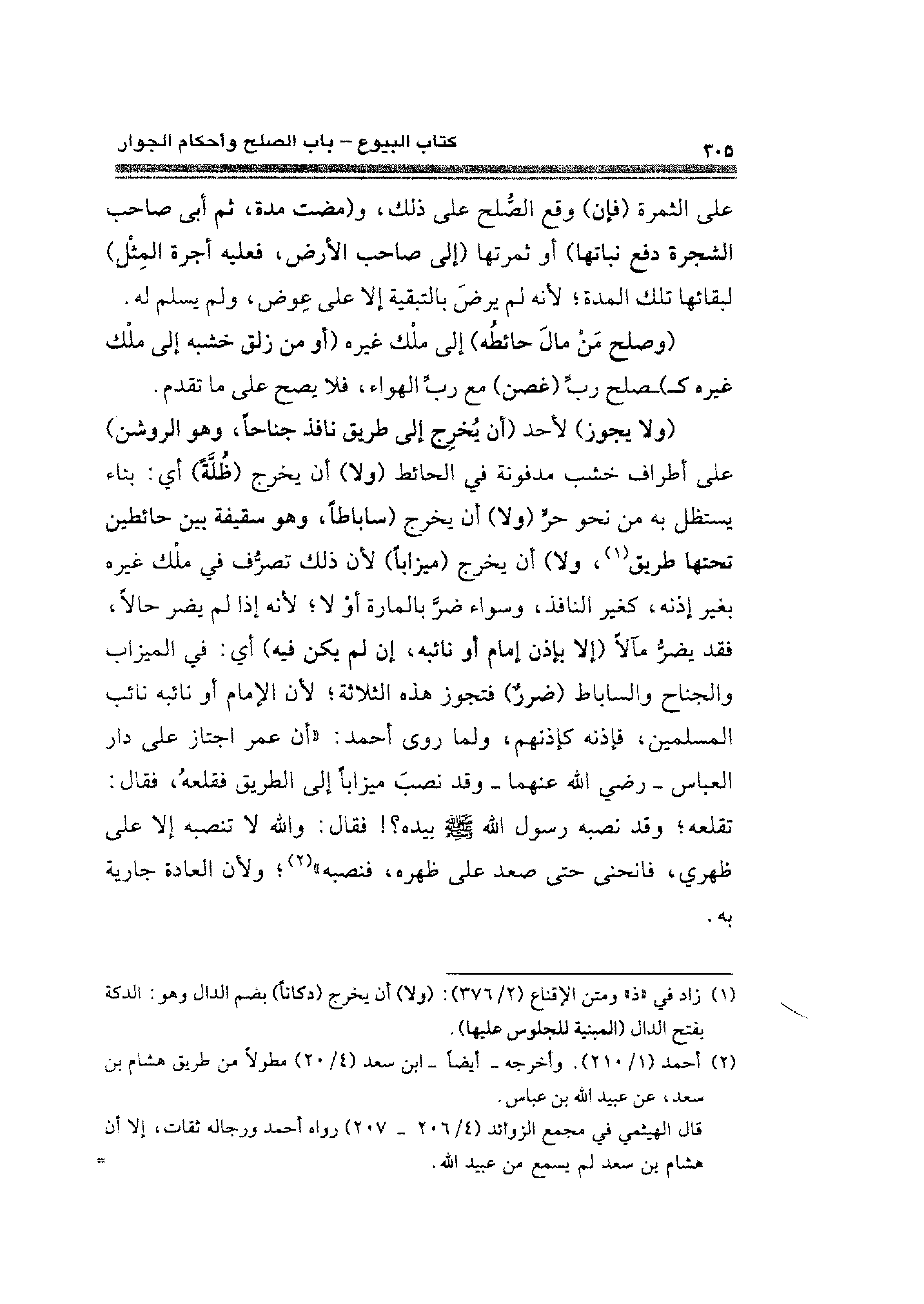 (ولا يجوز) لأحد (أن يُخرِج إلى طريق نافذ جناحًا، وهو الروشن) على أطراف خشب مدفونة في الحائط (ولا) أن بخرج (ظُلَّةً) أي: بناء يستظل به من نحو حرٍّ (ولا) أن يخرج (ساباطًا، وهو سقيفة بين حائطين تحتها طريق (¬١)، ولا) أن يخرج (ميزابًا) لأن ذلك تصرُّفْ في ملْك غيره بغير إذنه، كغير النافذ، وسواء ضرَّ بالمارة أوْ لا؛ لأنه إذا لم يضر حالًا، فقد يضرُّ مآلًا (إلا بإذن إمام أو نائبه، إن لم يكن فيه) أي: في الميزاب والجناح والساباط، (ضررٌ) فتجوز هذه الثلاثة؛ لأن الإمام أو نائبه نائب المسلمين، فإذنه كإذنهم، ولما روى أحمد: "أن عمر اجتاز على دار العباس - رضي الله عنهما - وقد نصبَ ميزابًا إلى الطريق فقلعهُ، فقال: تقلعه؛ وقد نصبه رسول الله - صلى الله عليه وسلم - بيده؟! فقال: والله لا تنصبه إِلا على ظهري، فانحنى حتى صعد على ظهره، فنصبه" (¬٢)؛ ولأن العادة جارية به.