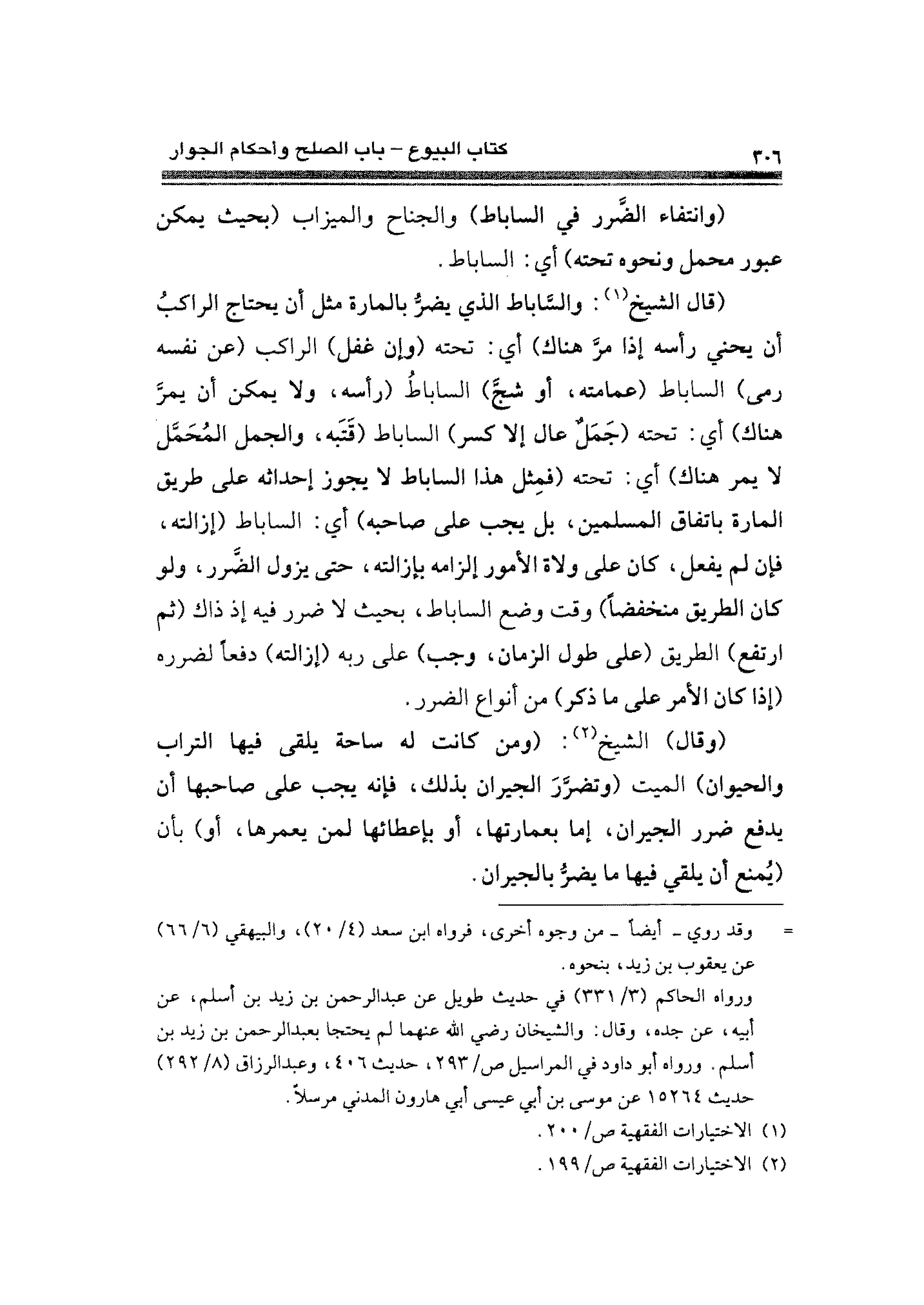 (قال الشيخ (¬١): والسَّاباط الذي يضرُّ بالمارة مثل أن يحتاج الراكبُ أن يحني رأسه إذا مرَّ هناك) أي: تحته (وإن غفل) الراكب (عن نفسه رمى) الساباط (عمامته، أو شجَّ) الساباطُ (رأسه، ولا يمكن أن يمرَّ هناك) أي: تحته (جَمَلٌ عال إلا كسر) الساباط (قَتَبه، والجمل المُحَمَّل لا يمر هناك) أي: تحته (فمِثل هذا الساباط لا يجوز إحداثه على طريق المارة باتفاق المسلمين، بل يجب على صاحبه) أي: الساباط (إزالته، فإن لم يفعل، كان على ولاة الأمور إلزامه بإزالته، حتى يزول الضَّرر، ولو كان الطريق منخفضًا) وقت وضع الساباط، بحيث لا ضرر فيه إذ ذاك (ثم ارتفع) الطريق (على طول الزمان، وجب) على ربه (إزالته) دفعًا لضرره (إذا كان الأمر على ما ذكر) من أنواع الضرر.