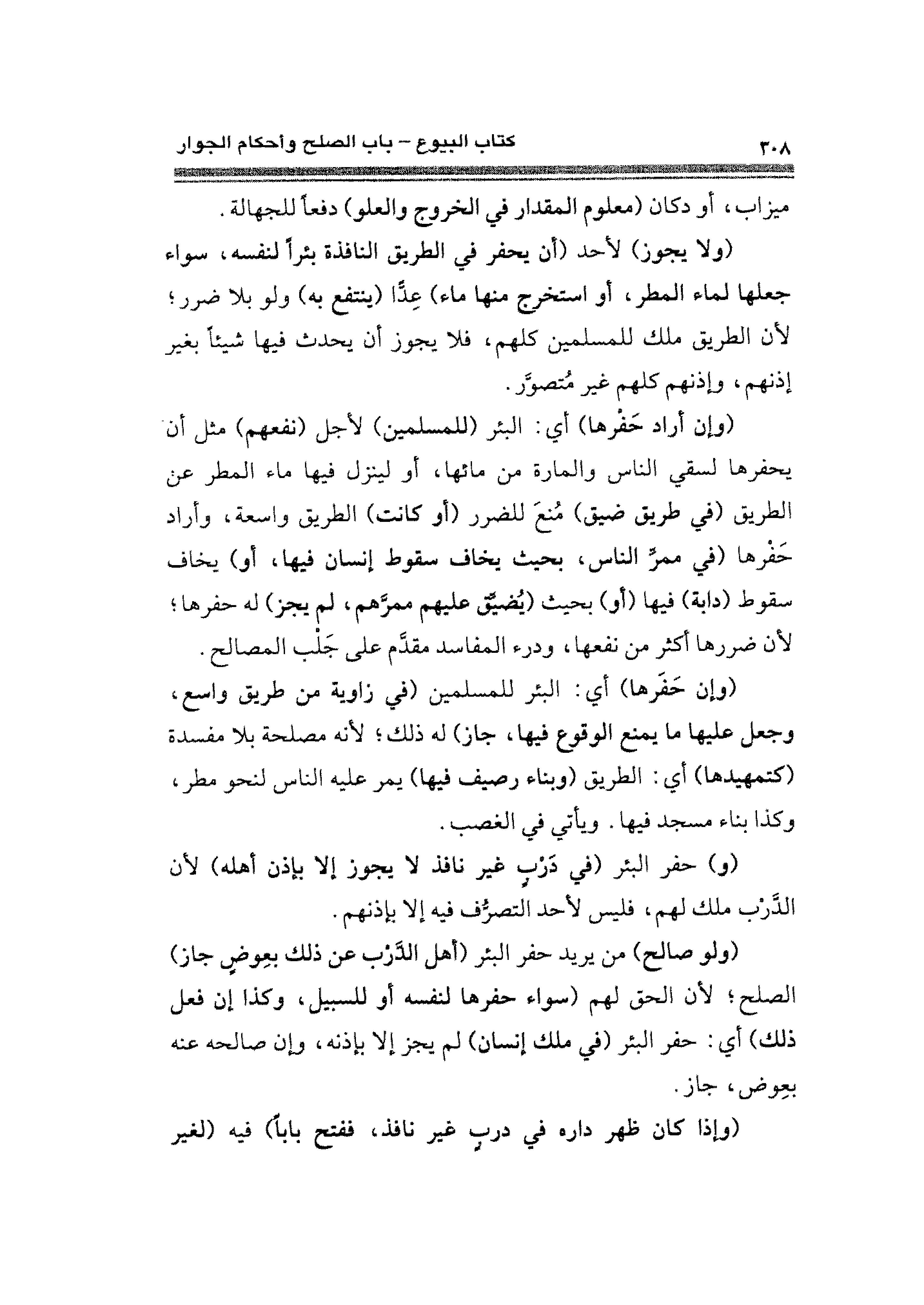 (ولا يجوز) لأحد (أن يحفر في الطريق النافذة بئرًا لنفسه، سواء جعلها لماء المطر، أو استخرج منها ماء) عِدًّا (ينتفع به) ولو بلا ضرر؛ لأن الطريق ملك للمسلمين كلهم، فلا يجوز أن يحدث فيها شيئًا بغير إذنهم، وإذنهم كلهم غير مُتصوَّر.