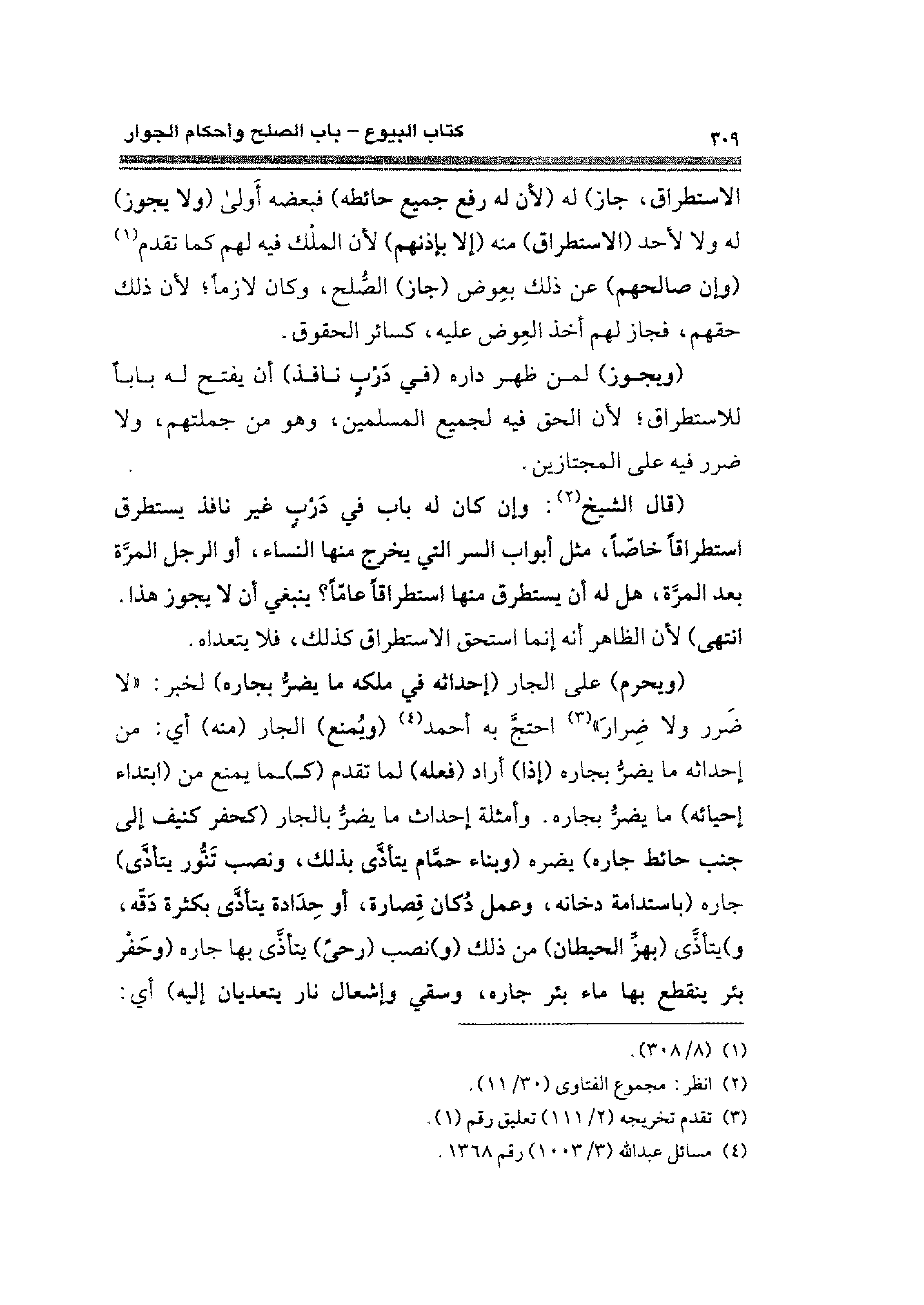 الاستطراق، جاز) له (لأن له رفع جميع حائطه) فبعضه أَولى (ولا يجوز) له ولا لأحد (الاستطراق) منه (إلا بإذنهم) لأن الملْك فيه لهم كما تقدم (¬١) (وإن صالحهم) عن ذلك بعِوض (جاز) الصُّلح، وكان لازمًا؛ لأن ذلك حقهم، فجاز لهم أخذ العِوض عليه، كسائر الحقوق.