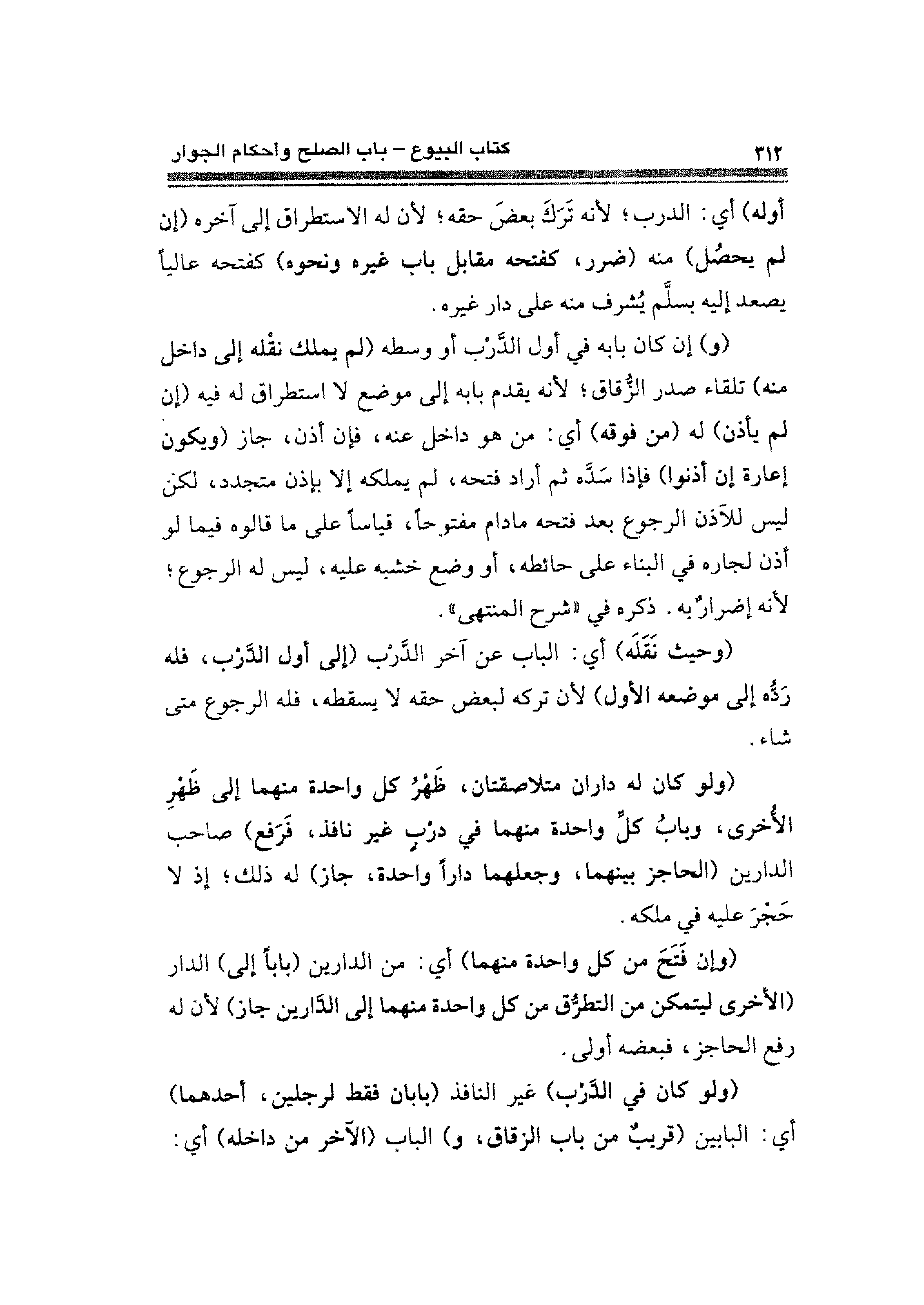 (و) إن كان بابه في أول الدَّرْب أو وسطه (لم يملك نقله إلى داخل منه) تلقاء صدر الزُّقاق؛ لأنه يقدم بابه إلى موضع لا استطراق له فيه (إن لم يأذن) له (من فوقه) أي: من هو داخل عنه، فإن أذن، جاز (ويكون أعارة إن أذنوا) فإذا سَدَّه ثم أراد فتحه، لم يملكه إلا بإذن متجدد، لكن ليس للآذن الرجوع بعد فتحه ما دام مفتوحًا، قياسًا على ما قالوه فيما لو أذن لجاره في البناء على حائطه، أو وضع خشبه عليه، ليس له الرجوع؛ لأنه إضرارٌ به. ذكره في "شرح المنتهى".