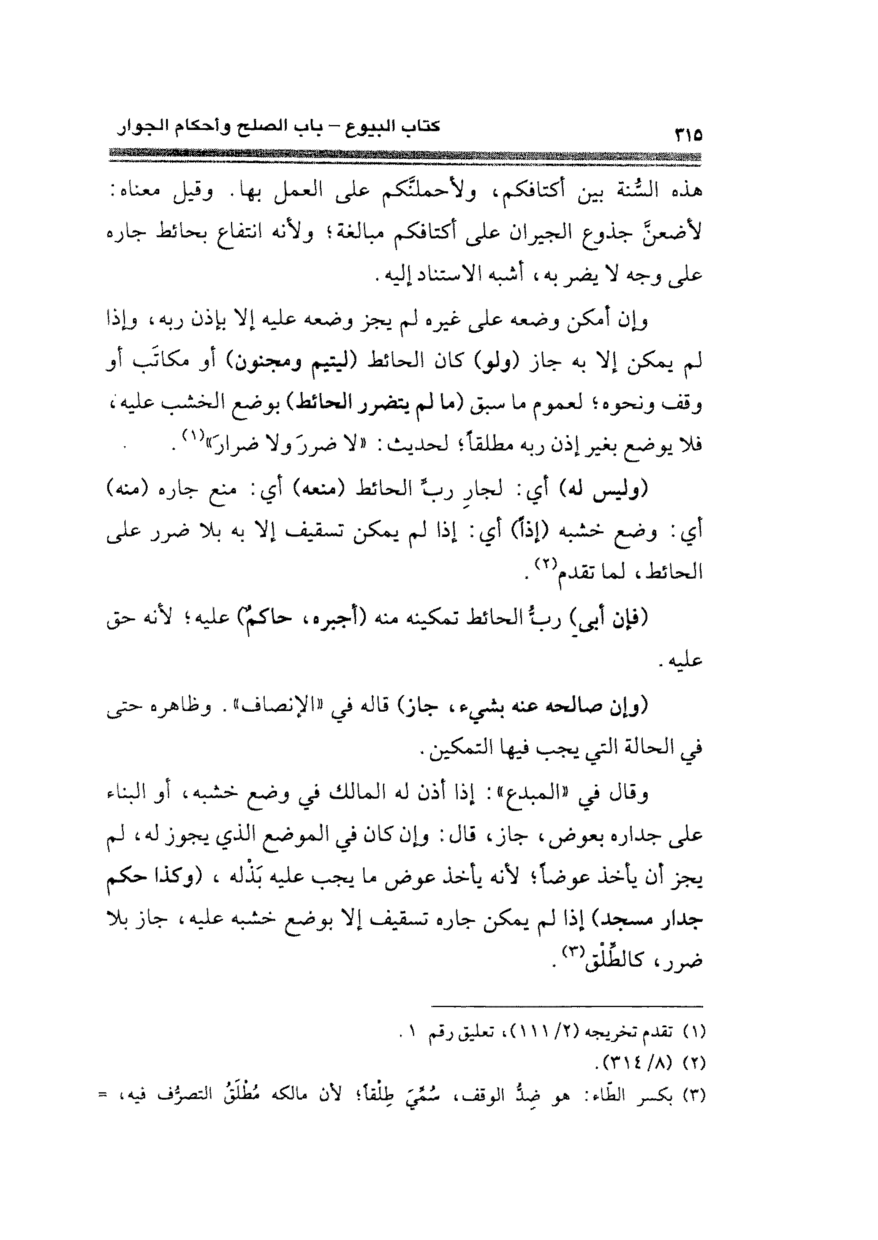 وقال في "المبدع": إذا أذن له المالك في وضع خشبه، أو البناء على جداره بعوض، جاز، قال: وإن كان في الموضع الذي يجوز له، لم يجز أن يأخذ عوضًا؛ لأنه يأخذ عوض ما يجب عليه بَذْله، (وكذا حكم جدار مسجد) إذا لم يمكن جاره تسقيف إلا بوضع خشبه عليه، جاز بلا ضرر، كالطِّلْق (¬٣).