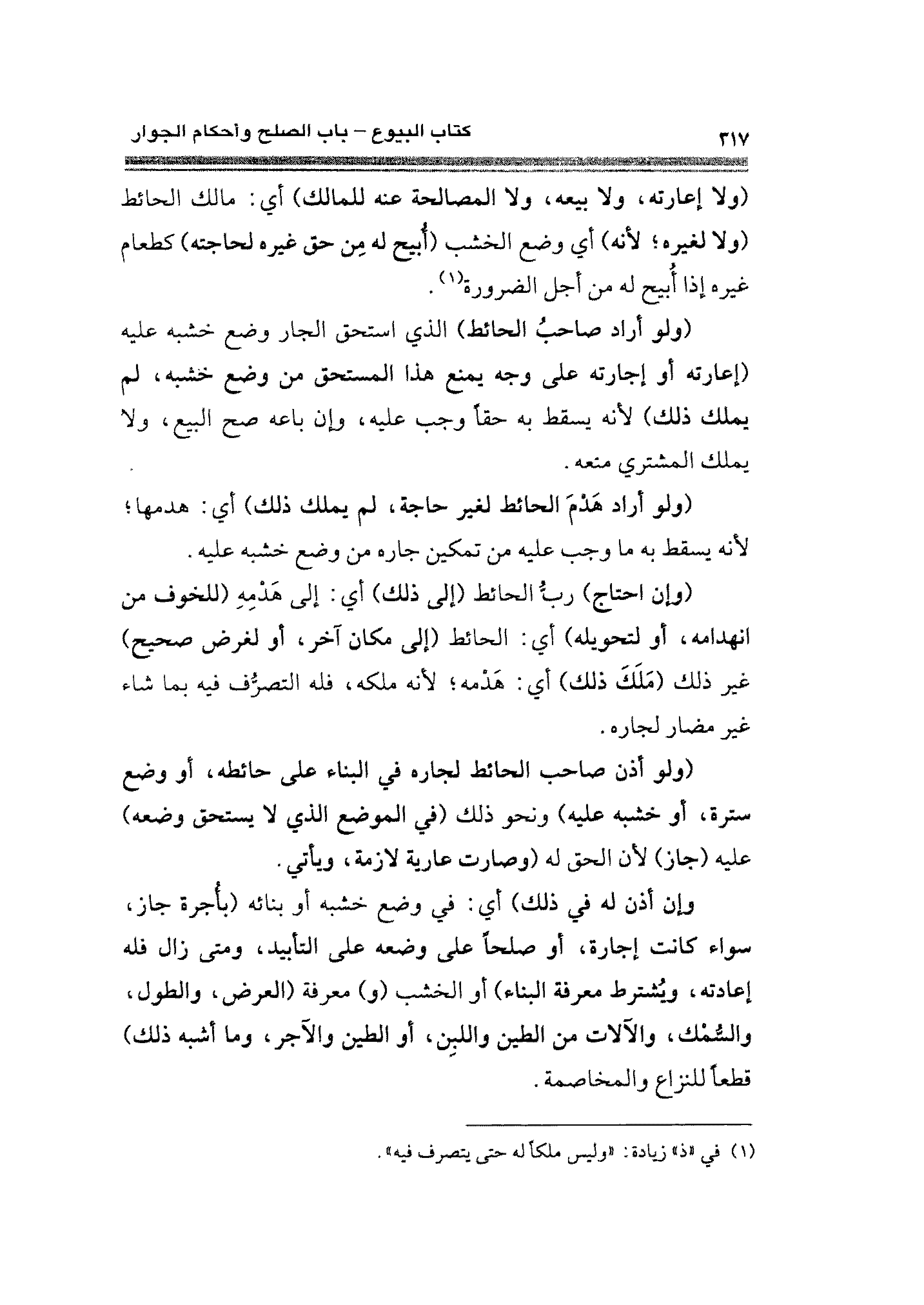 (ولا إعارته، ولا بيعه، ولا المصالحة عنه للمالك) أي: مالك الحائط (ولا لغيره؛ لأنه) أي وضع الخشب (أُبيح له مِن حق غيره لحاجته) كطعام غيره إذا أُبيح له من أجل الضرورة (¬١).