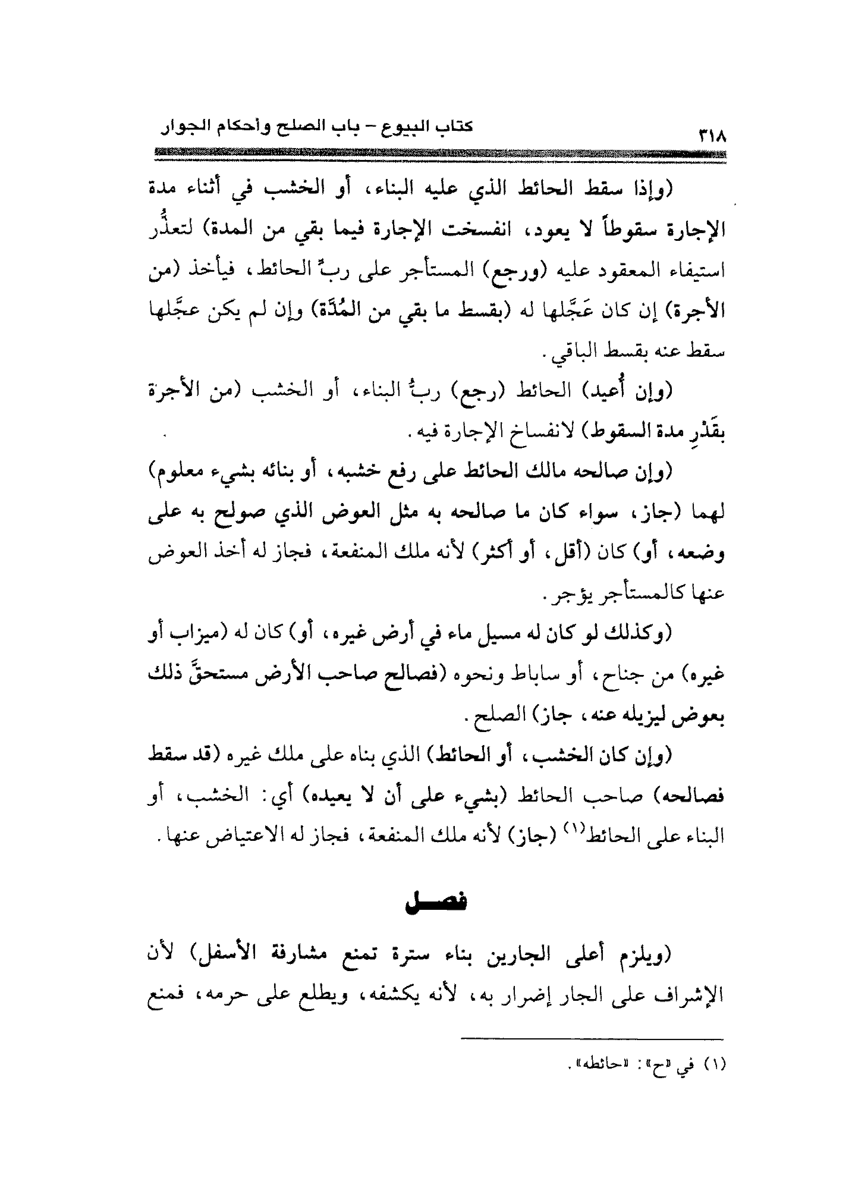(وإذا سقط الحائط الَّذي عليه البناء، أو الخشب في أثناء مدة الإجارة سقوطًا لا يعود، انفسخت الإجارة فيما بقي عن المدة) لتعذُّر استيفاء المعقود عيه (ورجع) المستأجر على ربِّ الحائط، فيأخذ (من الأجرة) إن كان عَجَّلها له (بقسط ما بقي من المُدَّة) بيان لم يكن عجَّلها سقط عنه بقسط الباقي.