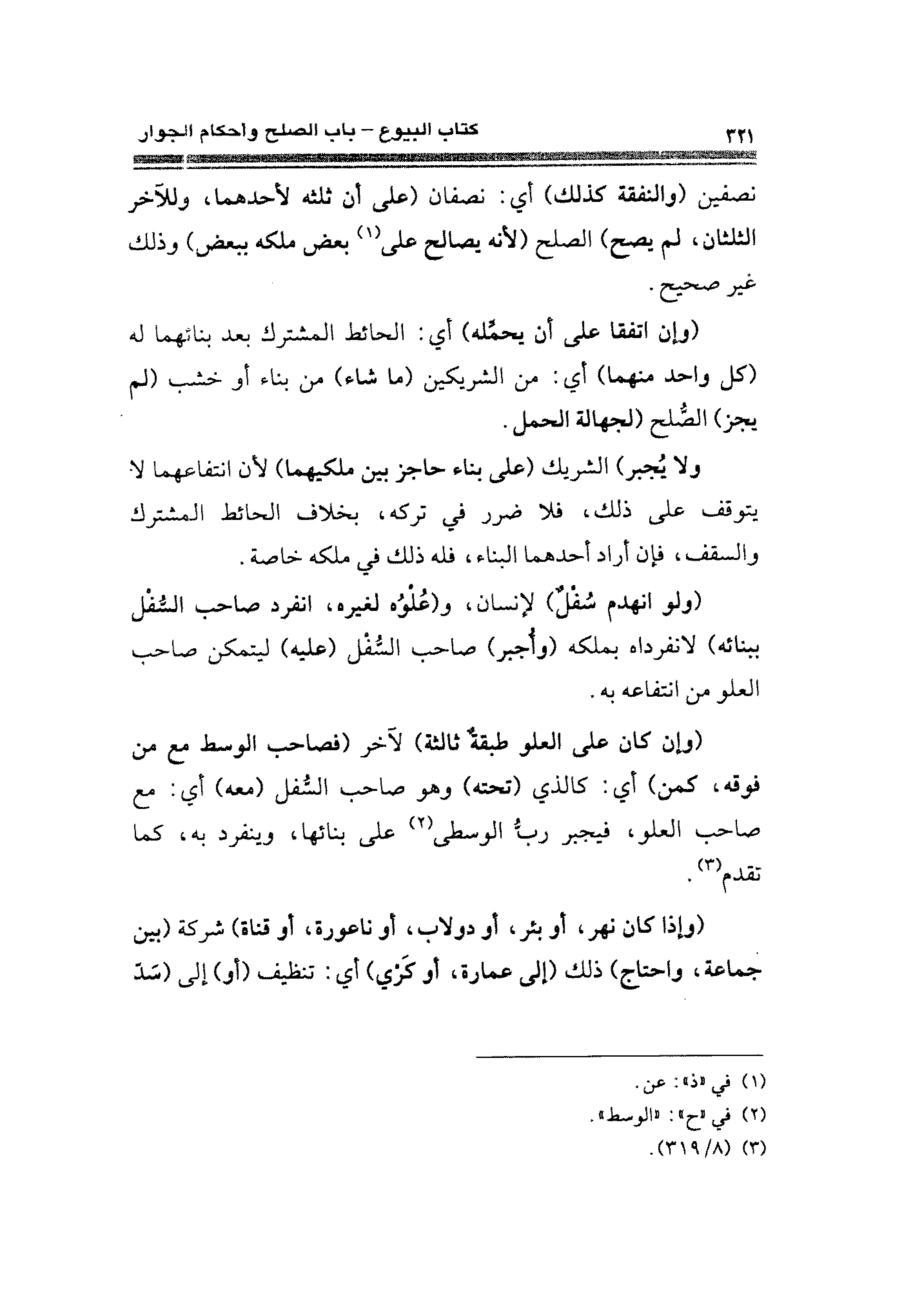(وإن كان على العلو طبقةٌ ثالثة) لآخر (فصاحب الوسط مع من فوقه، كمن) أي: كالذي (تحته) وهو صاحب السُّفل (معه) أي: مع صاحب العلو، فيجبر ربُّ الوسطى (¬٢) على بنائها، وينفرد به، كما تقدم (¬٣).