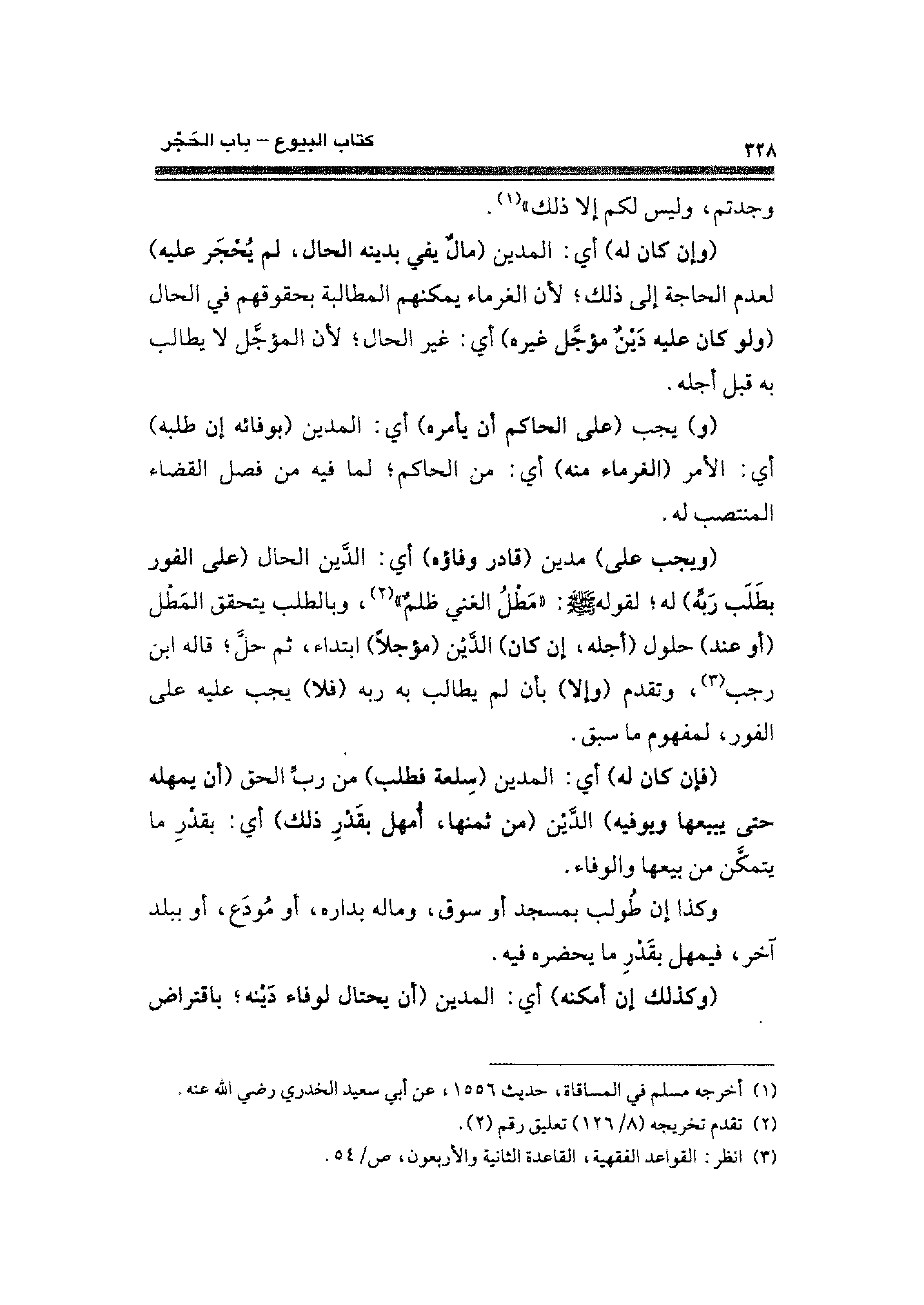(وإن كان له) أي: المدين (مالٌ يفي بدينه الحال، لم يُحْجَر عليه) لعدم الحاجة إلى ذلك؛ لأن الغرماء يمكنهم المطالبة بحقوقهم في الحال (ولو كان عليه دَينٌ مؤجَّل غيره) أي: غير الحال؛ لأن المؤجَّل لا يطالب به قبل أجله.