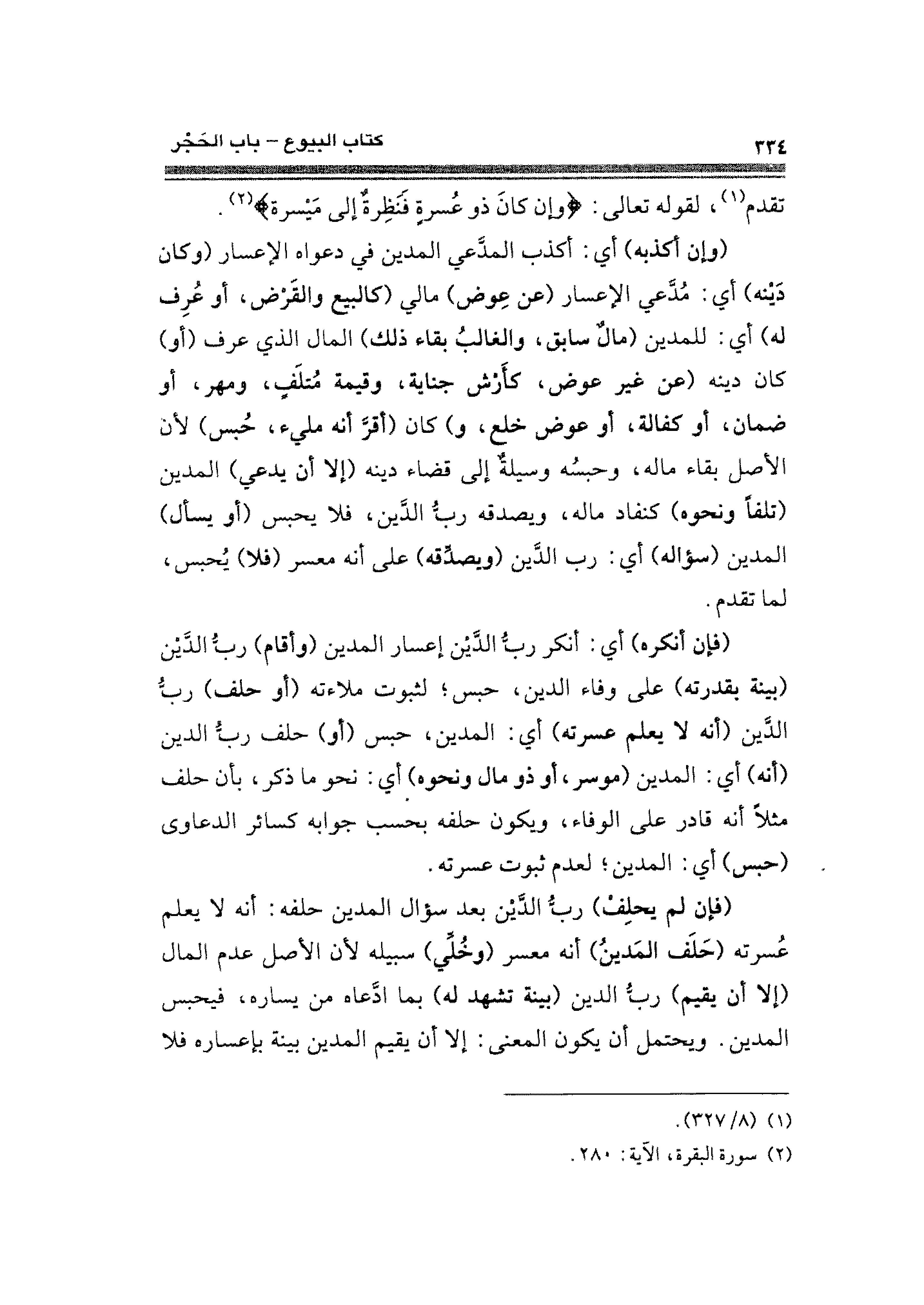 (فإن لم يحلِفْ) ربُّ الدَّين بعد سؤال المدين حلفه: أنه لا يعلم عُسرته (حَلَف المَدينُ) أنه معسر (وخُلِّي) سبيله لأن الأصل عدم المال (إلا أن يقيم) ربُّ الدين (بينة تشهد له) بما ادِّعاه من يساره، فيحبس المدين. ويحتمل أن يكون المعنى: إلا أن يقيم المدين بينة بإعساره فلا