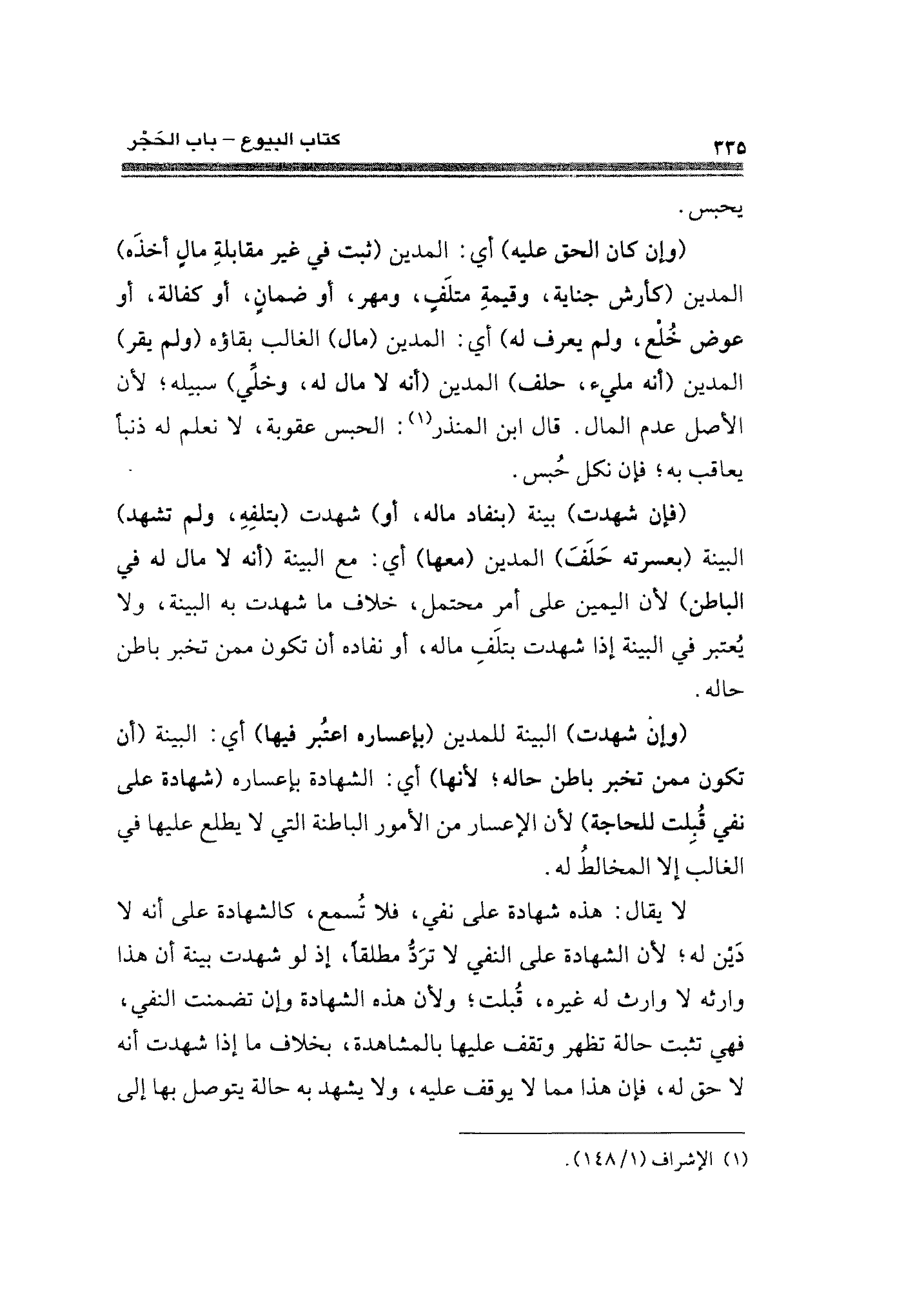 (وإن شهدت) البينة للمدين (بإعساره اعتُبر فيها) أي: البينة (أن تكون ممن تخبر باطن حاله؛ لأنها) أي: الشهادة بإعساره (شهادة على نفي قُبِلت للحاجة) لأن الإعسار من الأمور الباطنة التي لا يطلع عليها في الغالب إلا المخالطُ له.