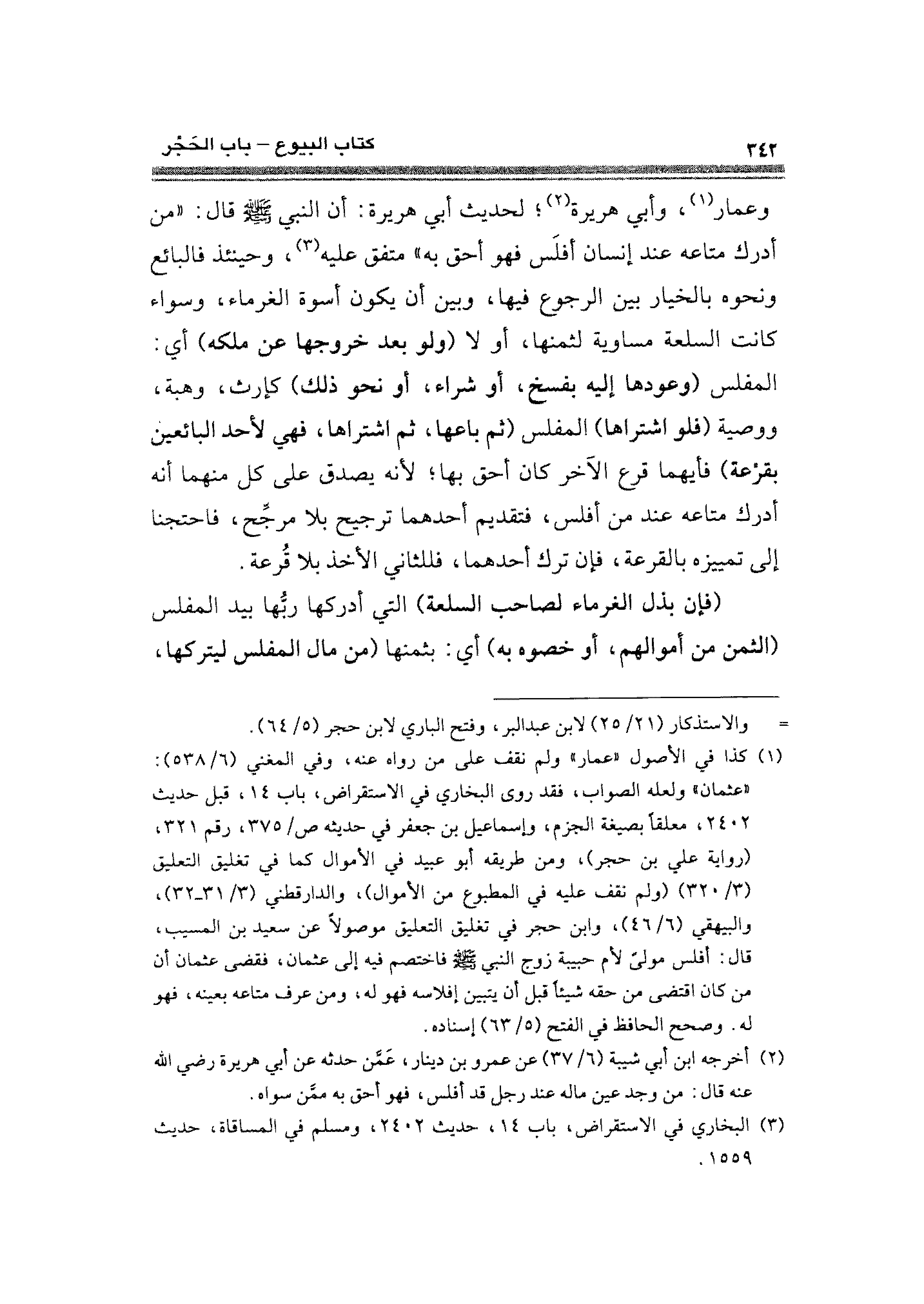 (¬١) كذا في الأصول "عمار" ولم نقف على من رواه عنه، وفي المغني (٦/ ٥٣٨): "عثمان" ولعله الصواب، فقد روى البخاري في الاستقراض، باب ١٤، قبل حديث ٢٤٠٢، معلقًا بصيغة الجزم وإسماعيل بن جعفر في حديثه ص / ٣٧٥، رقم ٣٣١، (رواية علي بن حجر)، ومن طريقه أبو عبيد في الأموال كما في تغليق التعليق (٣/ ٣٢٠) (ولم نقف عليه في المطبوع من الأموال)، والدارقطني (٣/ ٣١ - ٣٢)، والبيهقي (٦/ ٤٦)، وابن حجر في تغليق التعليق موصولًا عن سعيد بن المسيب، قال: أفلس مولىً لأم حبيبة زوج النبي - صلى الله عليه وسلم - فاختصم به إلى عثمان، فقضى عثمان أن من كان اقتضى من حقه شيئًا قبل أن يتبين إفلاسه فهو له، ومن عرف متاعه بعينه، فهو له. وصحح الحافظ في الفتح (٥/ ٦٣) إسناده.