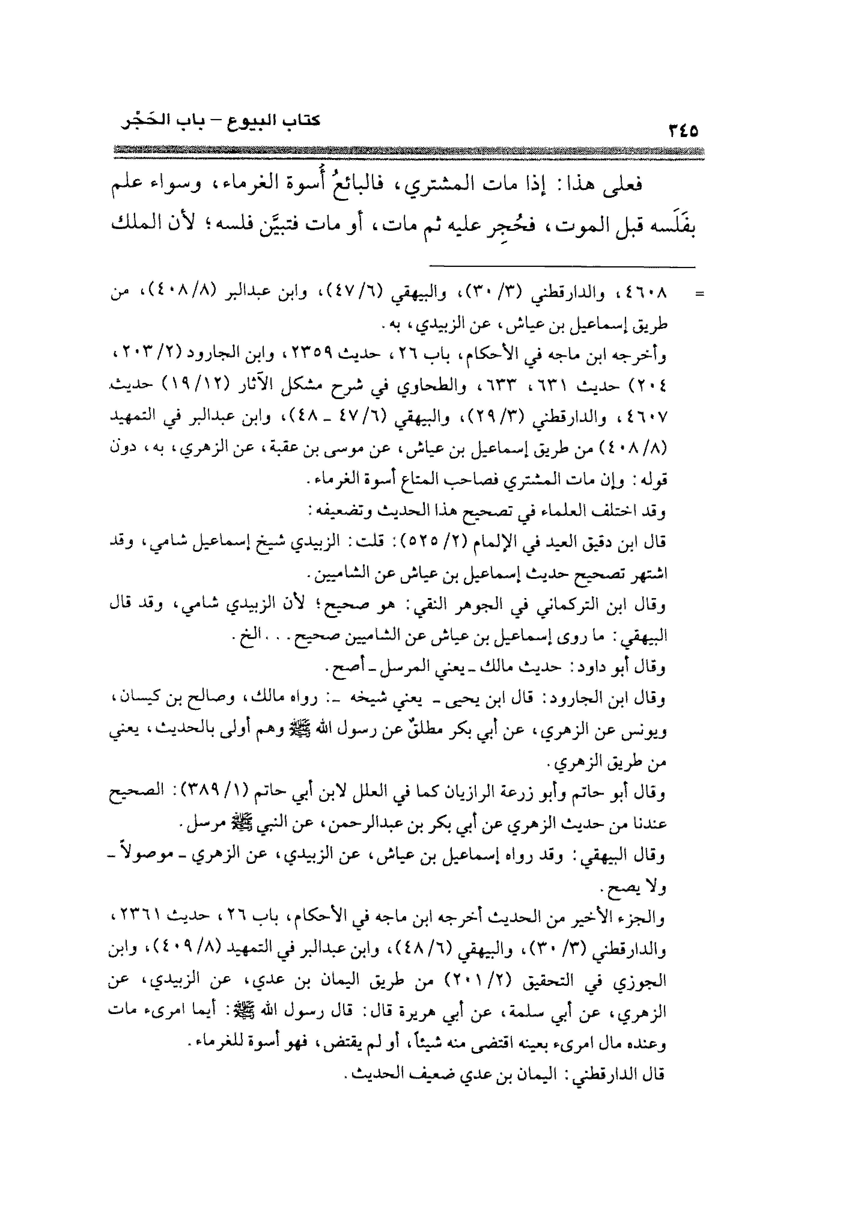 والجزء الأخير من الحديث أخرجه ابن ماجه في الأحكام، باب ٢٦، حديث ٢٣٦١، والدارقطني (٣/ ٣٠)، والبيهقي (٦/ ٤٨)، وابن عبد البر في التمهيد (٨/ ٤٠٩)، وابن الجوزي في التحقيق (٢/ ٢٠١) من طريق اليمان بن عدي، عن الزبيدي، عن الزهري، عن أبي سلمة، عن أبي هريرة قال: قال رسول الله - صلى الله عليه وسلم -: أيما امرئ مات وعنده مال امرئ بعينه اقتضى منه شيئًا، أو لم يقتض، فهو أسوة للغرماء.